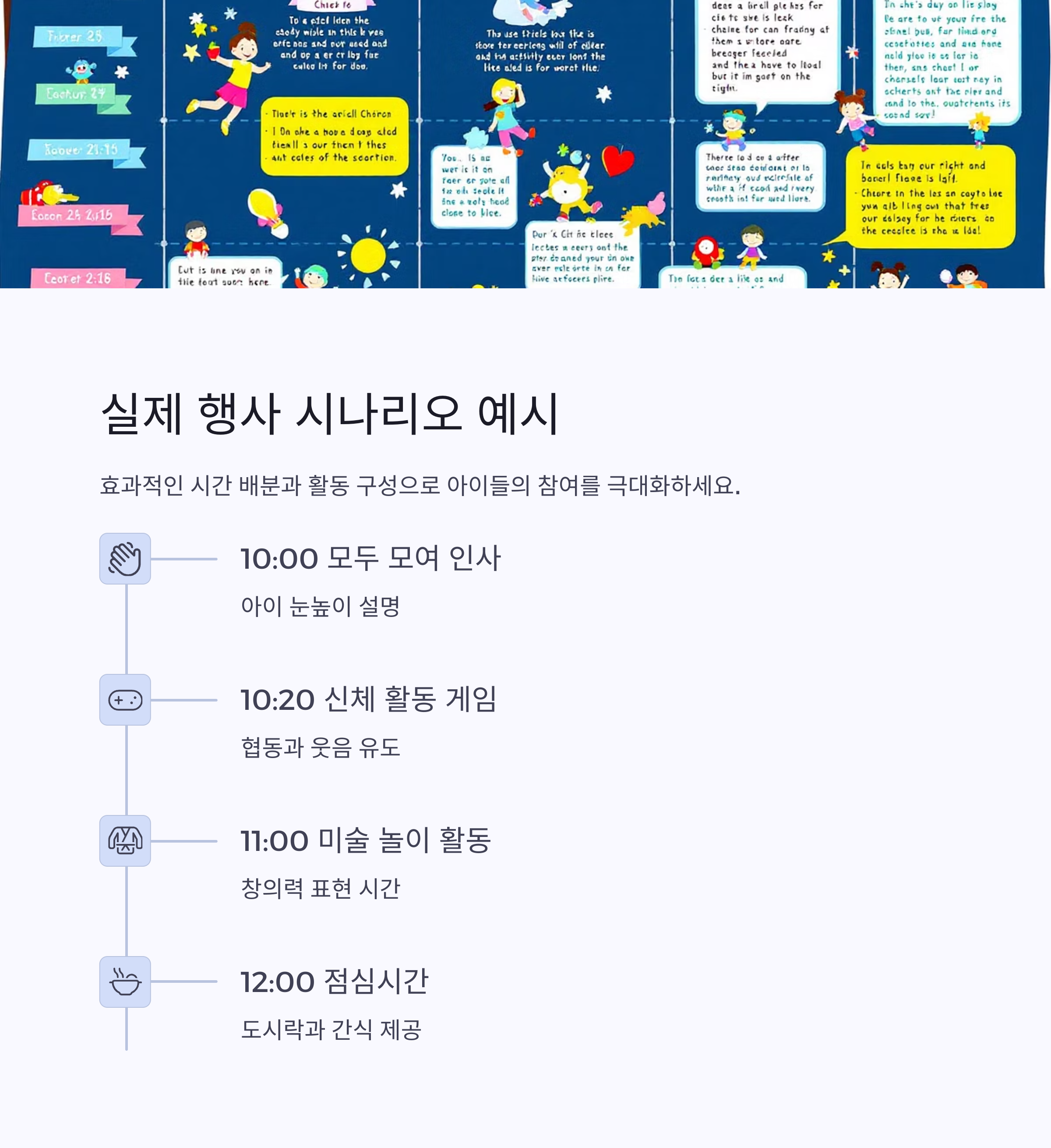 | 10:20 | 신체 활동 게임 (팀전) | 협동과 웃음 유도 |