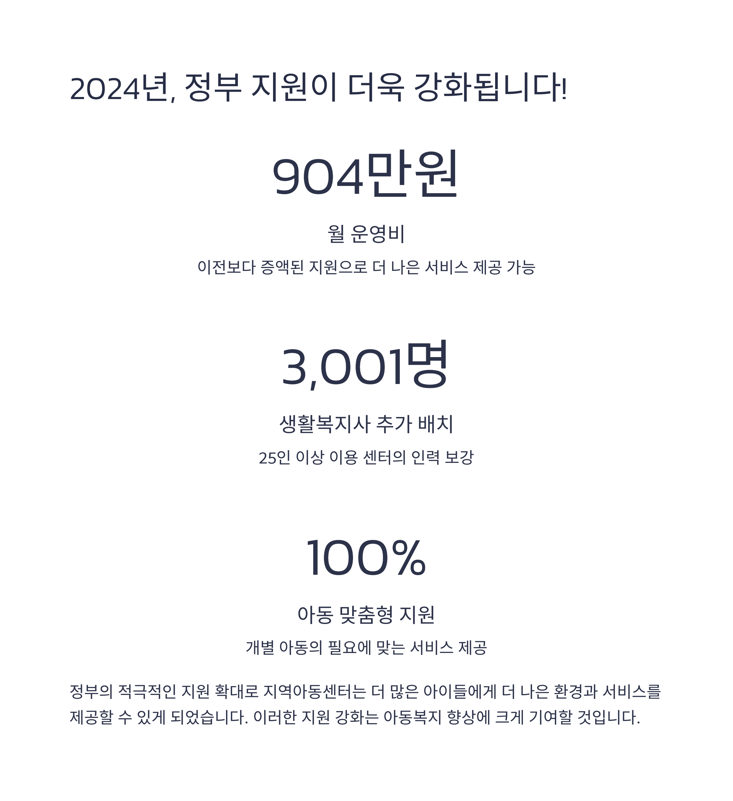 | 2024년에는 월 평균 지원 예산이 904만 원으로 늘었습니다. 생활복지사는 25인 이상 센터에 추가로 3,001명 배치됩니다. 맞춤형 돌봄 서비스가 강화되며, 지역사회 연계를 확대 중입니다. 예산 증가로 시설 개선과 프로그램 운영 효율성이 높아지고 있습니다. 이러한 변화는 아동 복지 서비스의 질을 전반적으로 향상시킬 것입니다. |