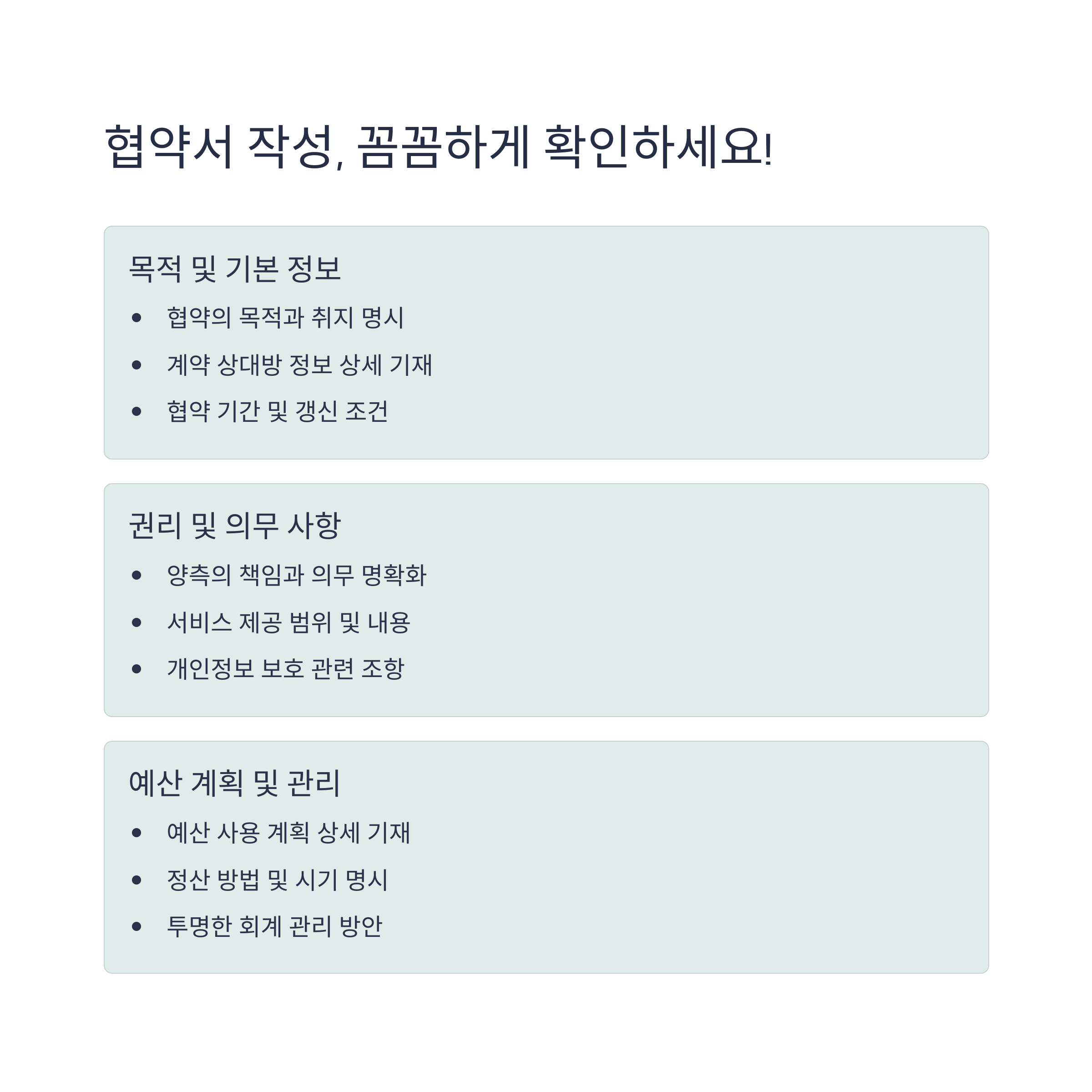 체크리스트 활용은 협약서 작성 시 발생할 수 있는 누락 및 오류 최소화에 필수적입니다.