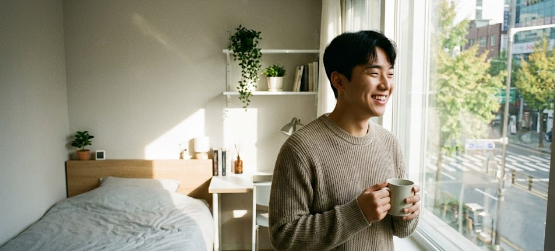 깨끗하게 정리된 나만의 첫 자취방에서 창밖을 보며 웃는 청년