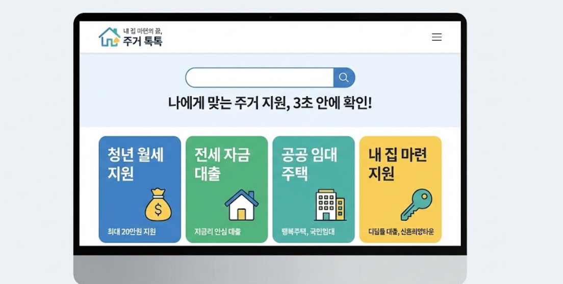 다양한 주거 지원 카테고리가 한눈에 보이는 깔끔한 웹사이트 메인 화면
