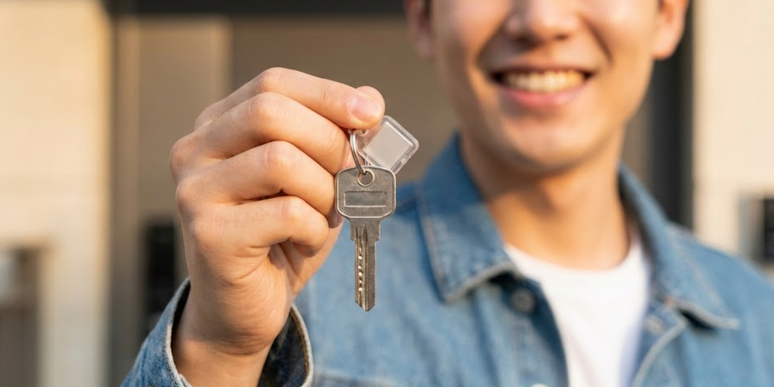 환하게 웃으며 집 열쇠를 들고 있는 청년의 손