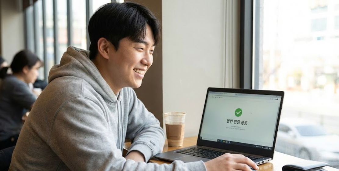 노트북 앞에서 간편하게 본인 인증을 마치고 미소 짓는 청년