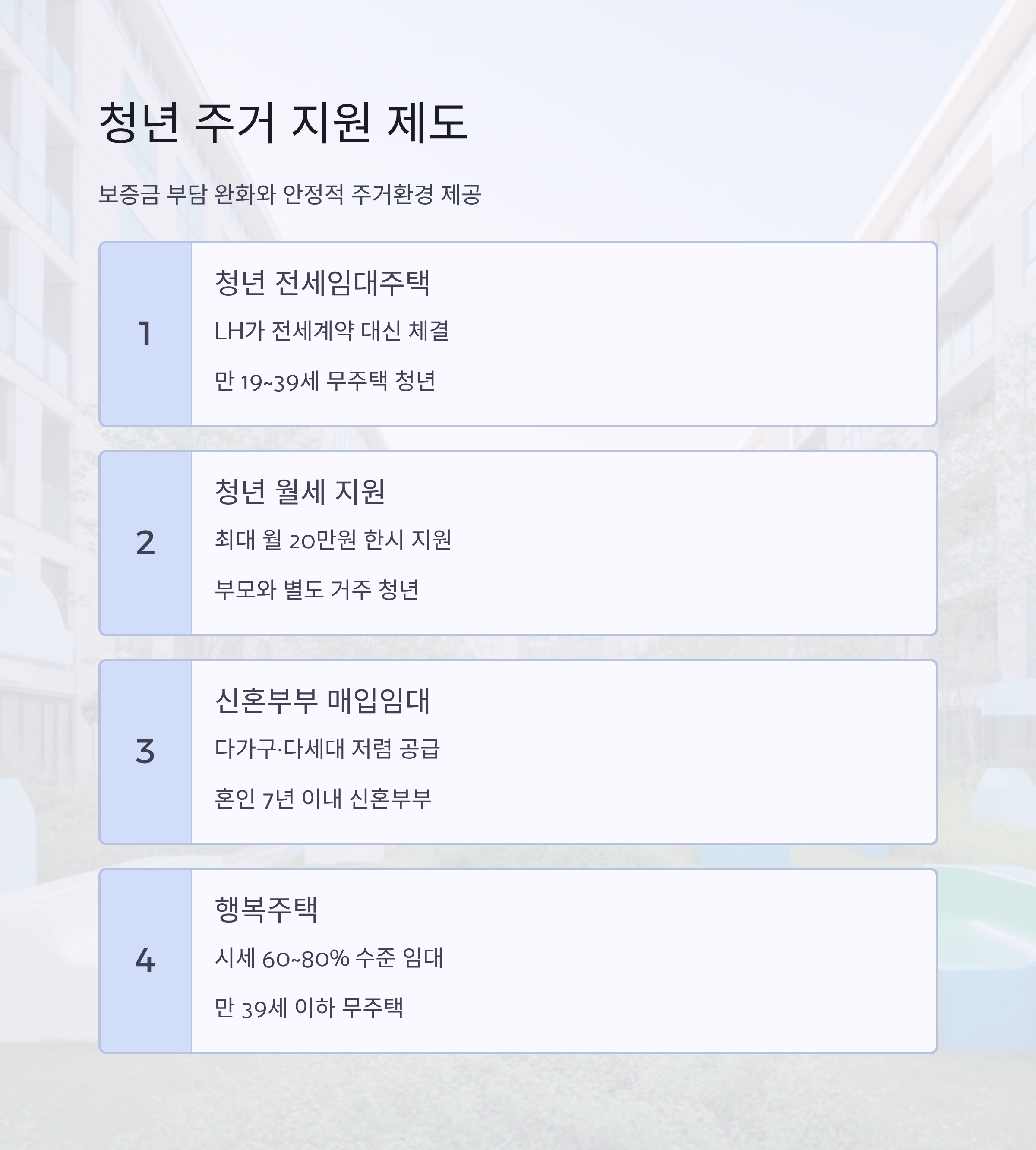 | 행복주택 | 대학생·청년·신혼부부에 시세의 60~80% 수준 임대 | 만 39세 이하, 무주택 가구 |