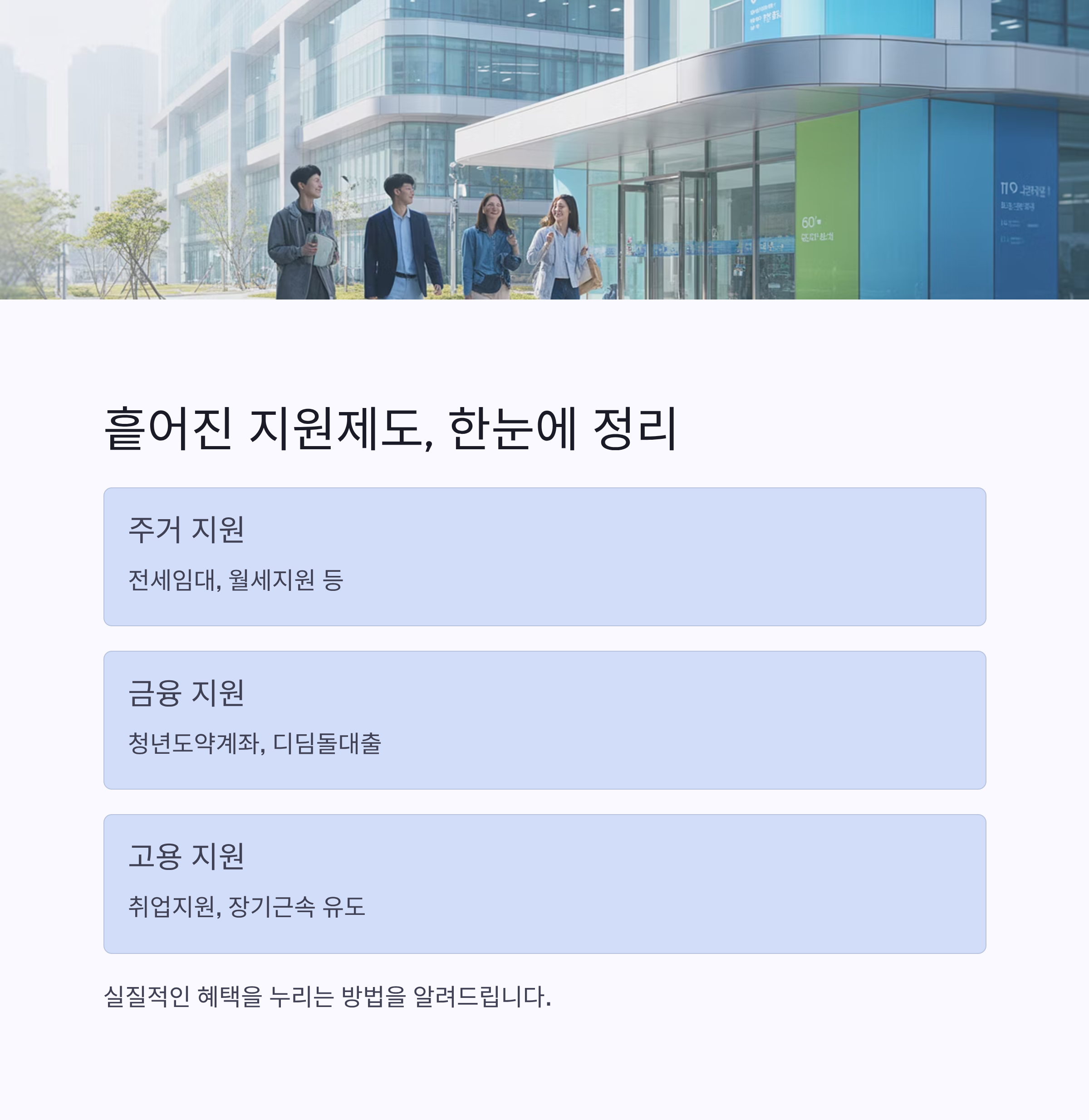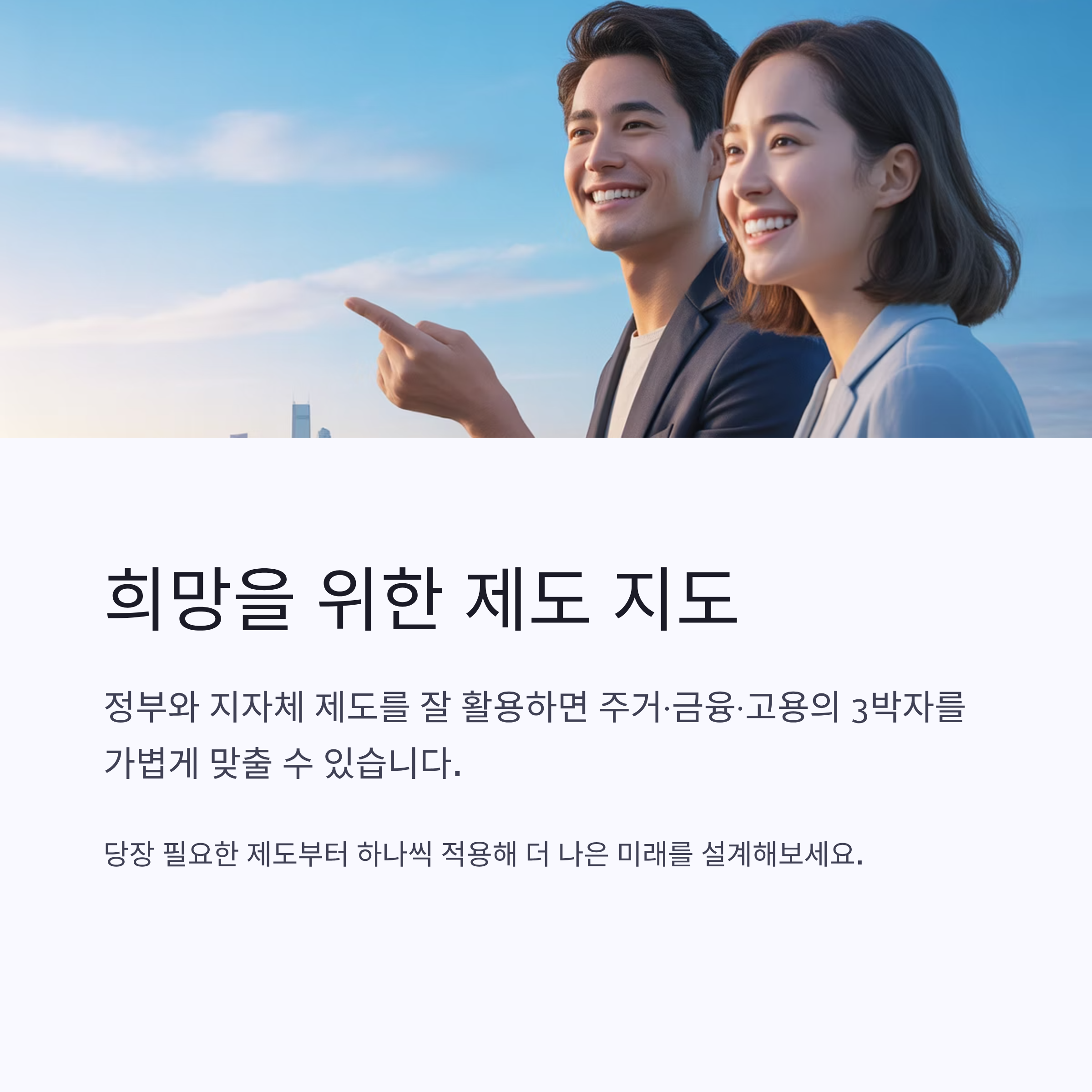 정부와 지자체가 마련한 제도를 잘 활용한다면 주거·금융·고용의 3박자를 조금은 가볍게 맞출 수 있습니다.