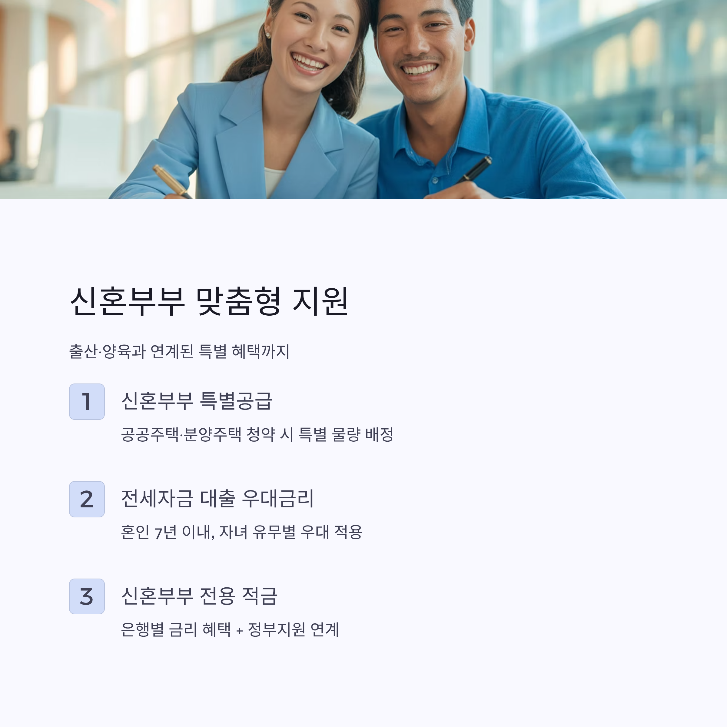 - 신혼부부 특별공급: 공공주택·분양주택 청약 시 특별 공급 물량 배정