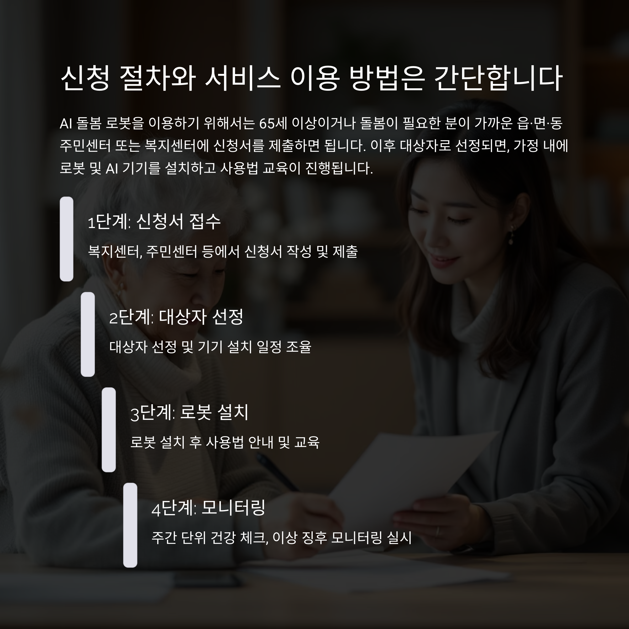 AI 돌봄 로봇을 이용하기 위해서는 65세 이상이거나 돌봄이 필요한 분이 가까운 읍·면·동 주민센터 또는 복지센터에 신청서를 제출하면 됩니다. 이후 대상자로 선정되면, 가정 내에 로봇 및 AI 기기를 설치하고 사용법 교육이 진행됩니다.