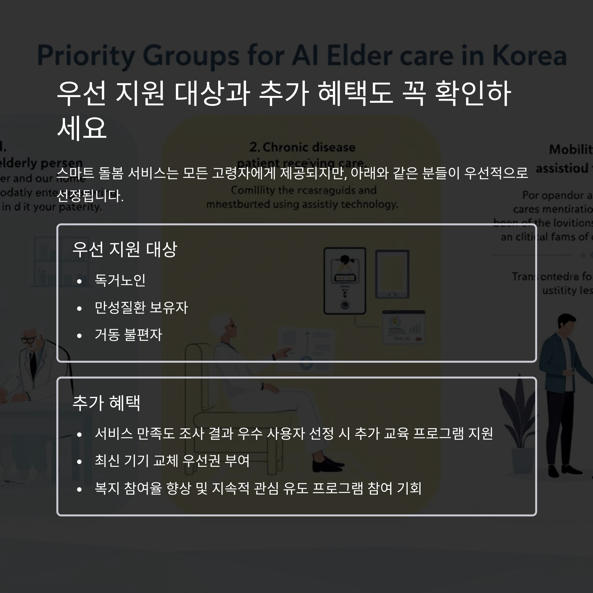 스마트 돌봄 서비스는 모든 고령자에게 제공되지만, 아래와 같은 분들이 우선적으로 선정됩니다.