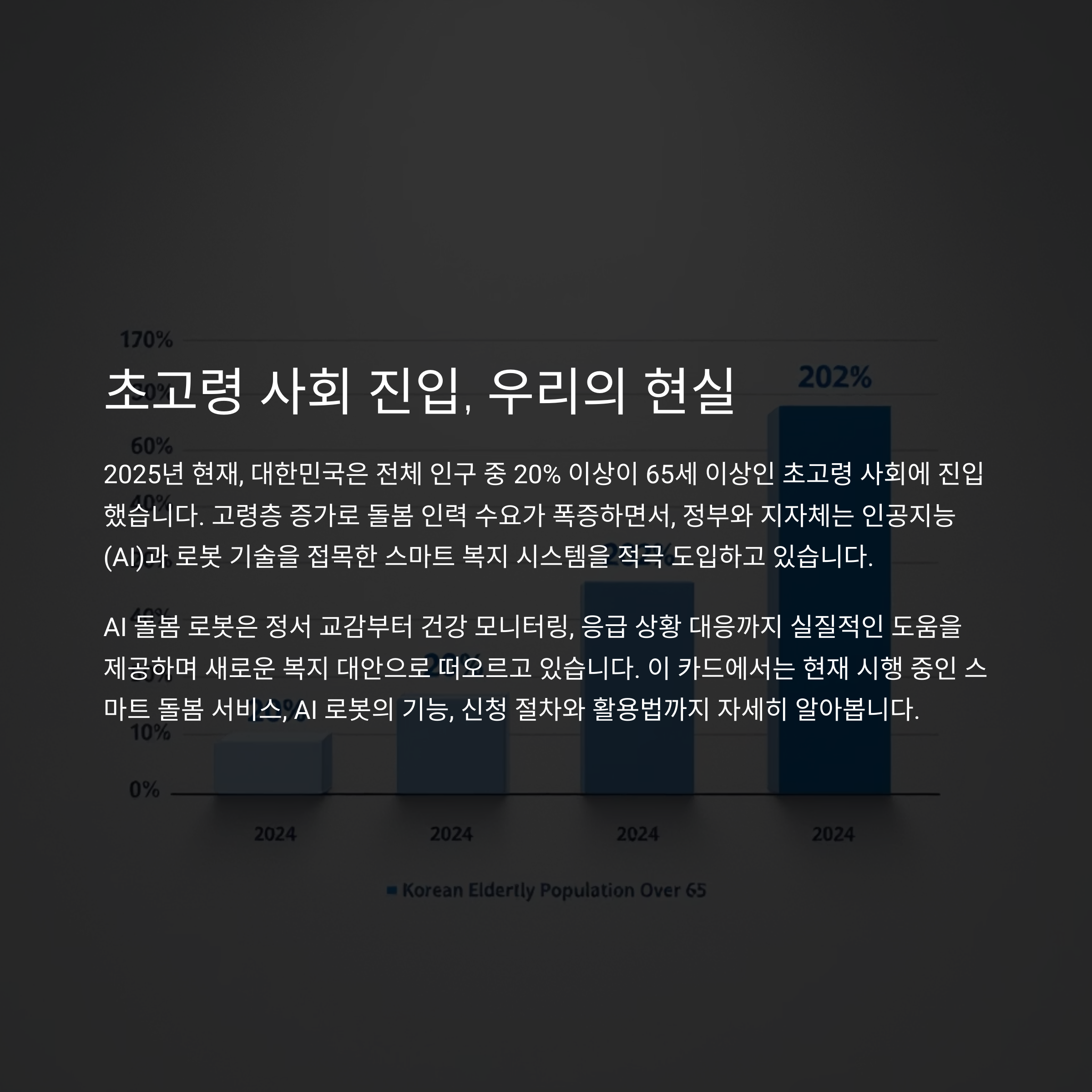 2025년 현재, 대한민국은 전체 인구 중 20% 이상이 65세 이상인 초고령 사회에 진입했습니다. 고령층 증가로 돌봄 인력 수요가 폭증하면서, 정부와 지자체는 인공지능(AI)과 로봇 기술을 접목한 스마트 복지 시스템을 적극 도입하고 있습니다. 특히 AI 돌봄 로봇은 정서 교감부터 건강 모니터링, 응급 상황 대응까지 실질적인 도움을 제공하며 새로운 복지 대안으로 떠오르고 있습니다. 이 글에서는 현재 시행 중인 스마트 돌봄 서비스, AI 로봇의 기능, 신청 절차와 활용법까지 자세히 알아봅니다.