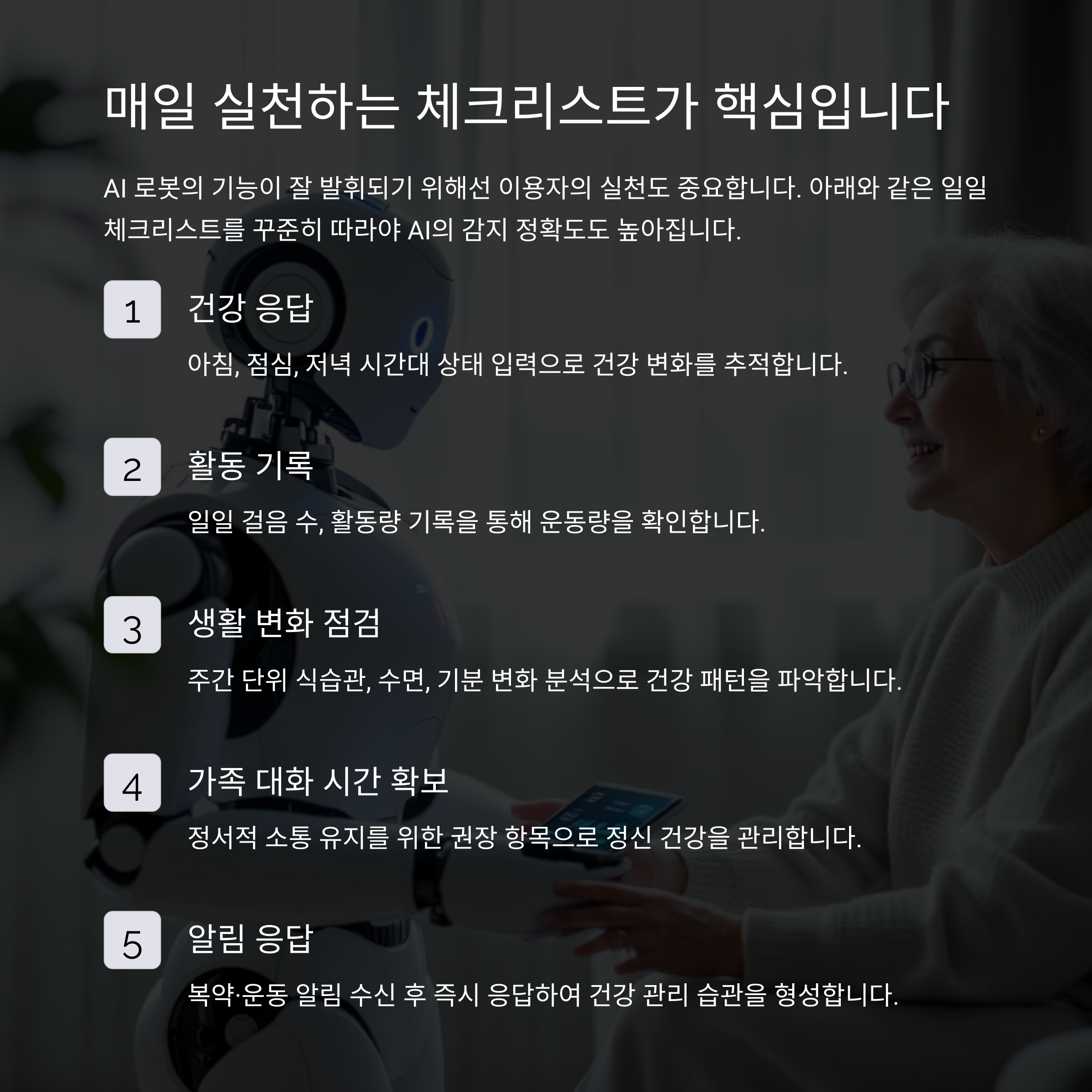 AI 로봇의 기능이 잘 발휘되기 위해선 이용자의 실천도 중요합니다. 아래와 같은 일일 체크리스트를 꾸준히 따라야 AI의 감지 정확도도 높아집니다.