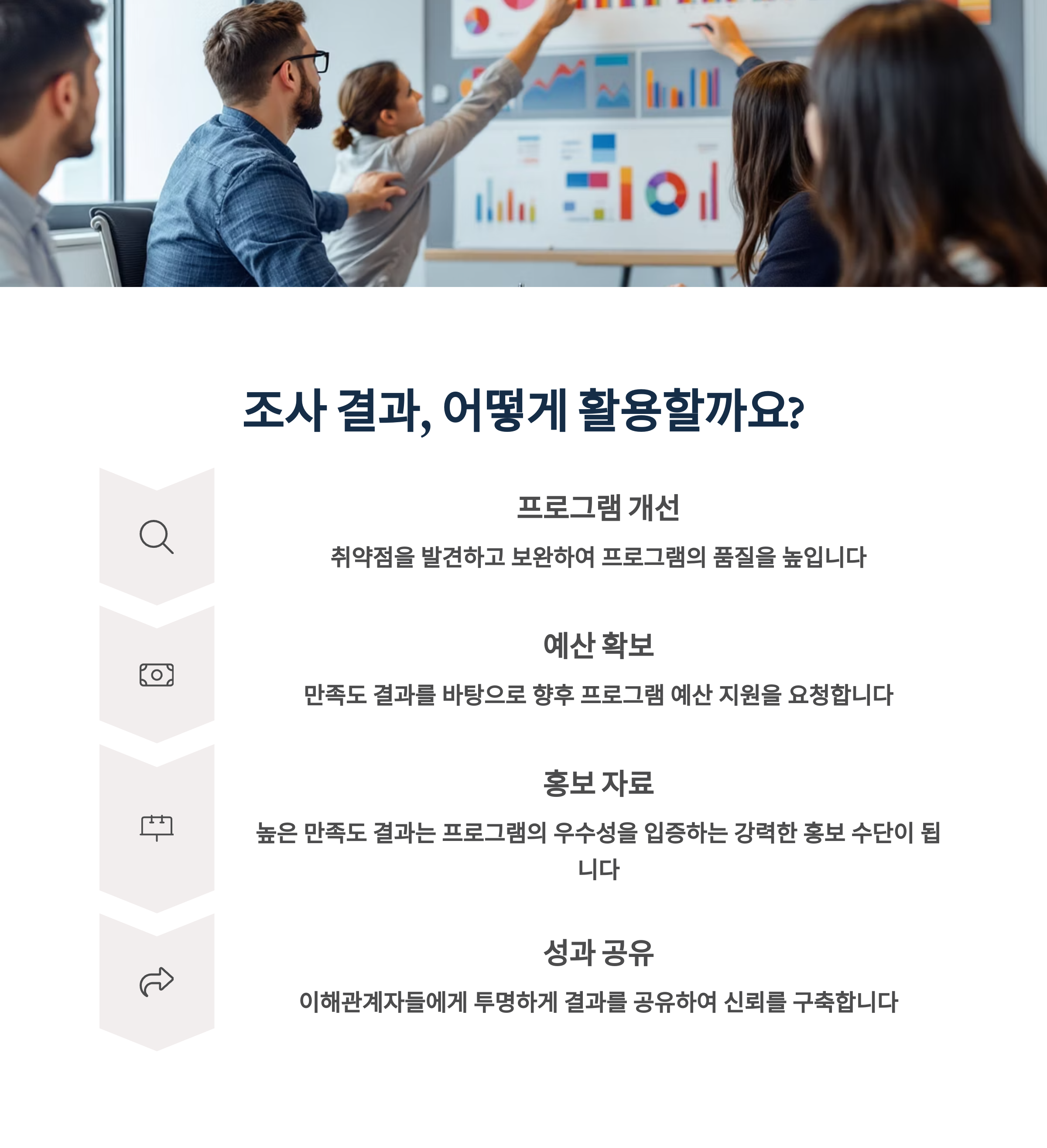 단순한 설문조사가 아닌, 데이터를 기반으로 한 분석과 평가 결과는 프로그램 방향 설정의 지침이 됩니다.