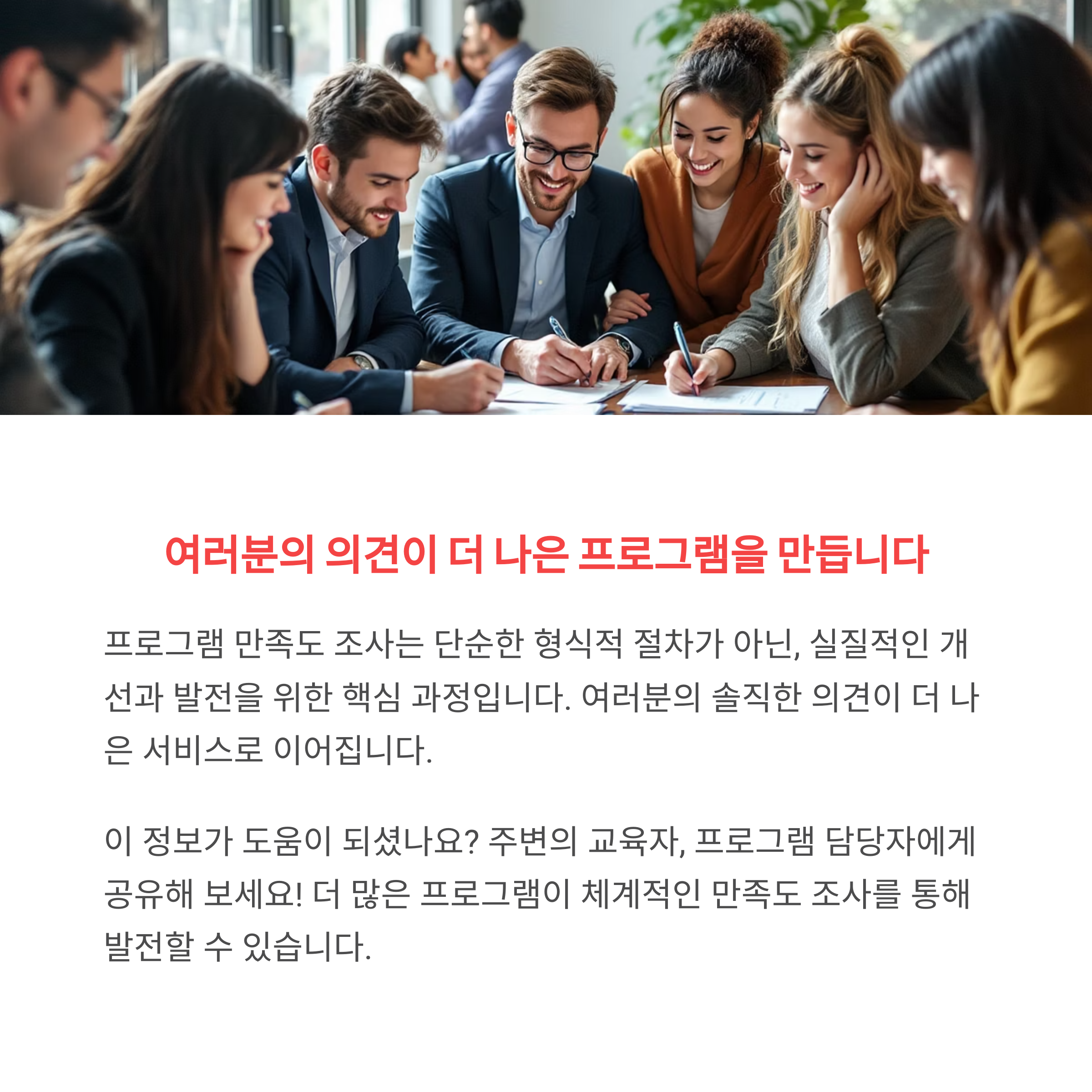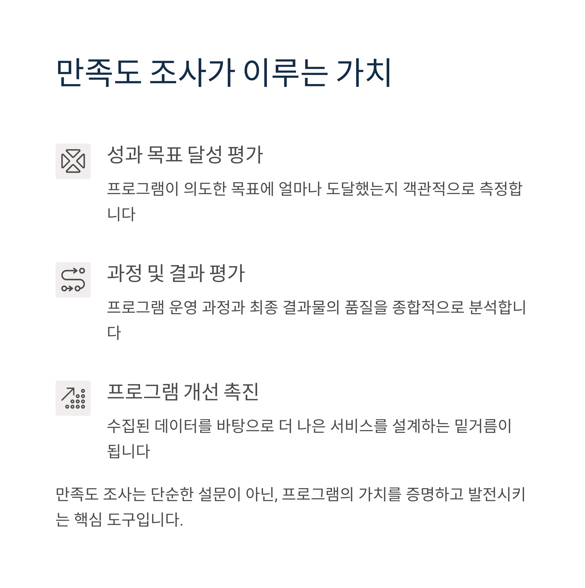 만족도 조사는 프로그램의 지속 가능성과 성공적인 개선을 위한 필수적 도구입니다.