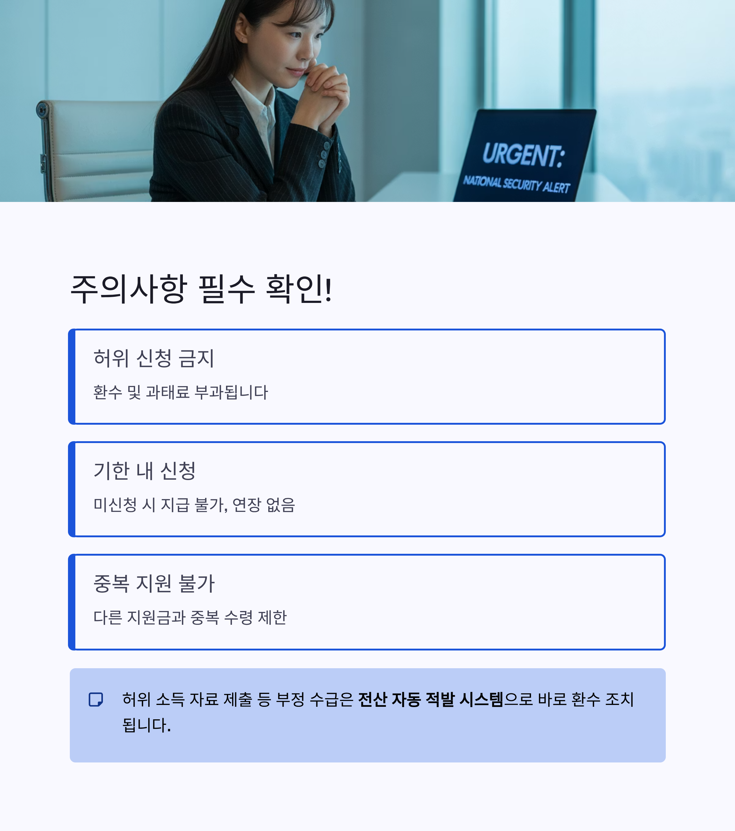 특히 허위 소득 자료 제출 등 부정 수급은 전산 자동 적발 시스템이 도입되어 바로 환수 조치됩니다.