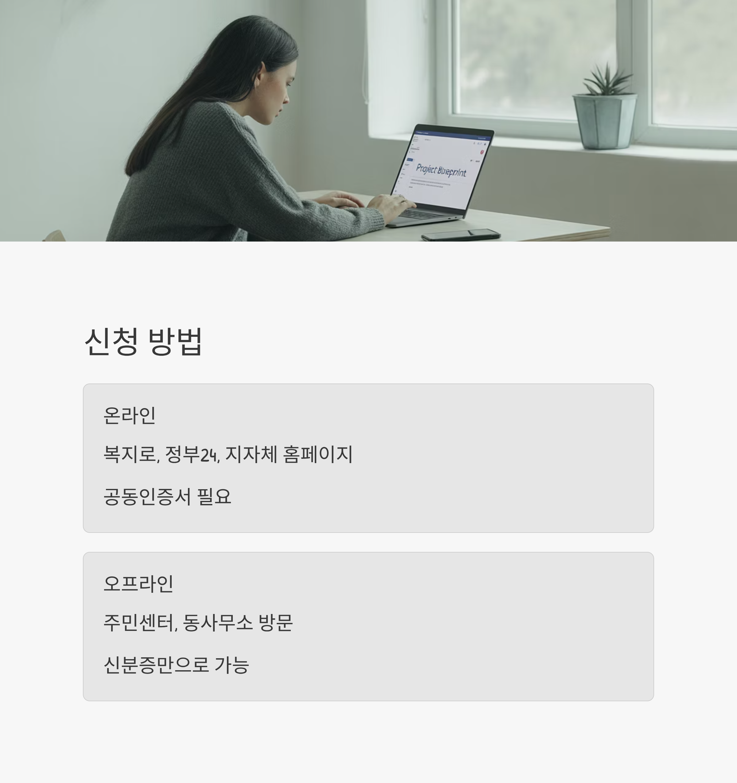 1. 온라인: 복지로, 정부 24, 각 지자체 홈페이지