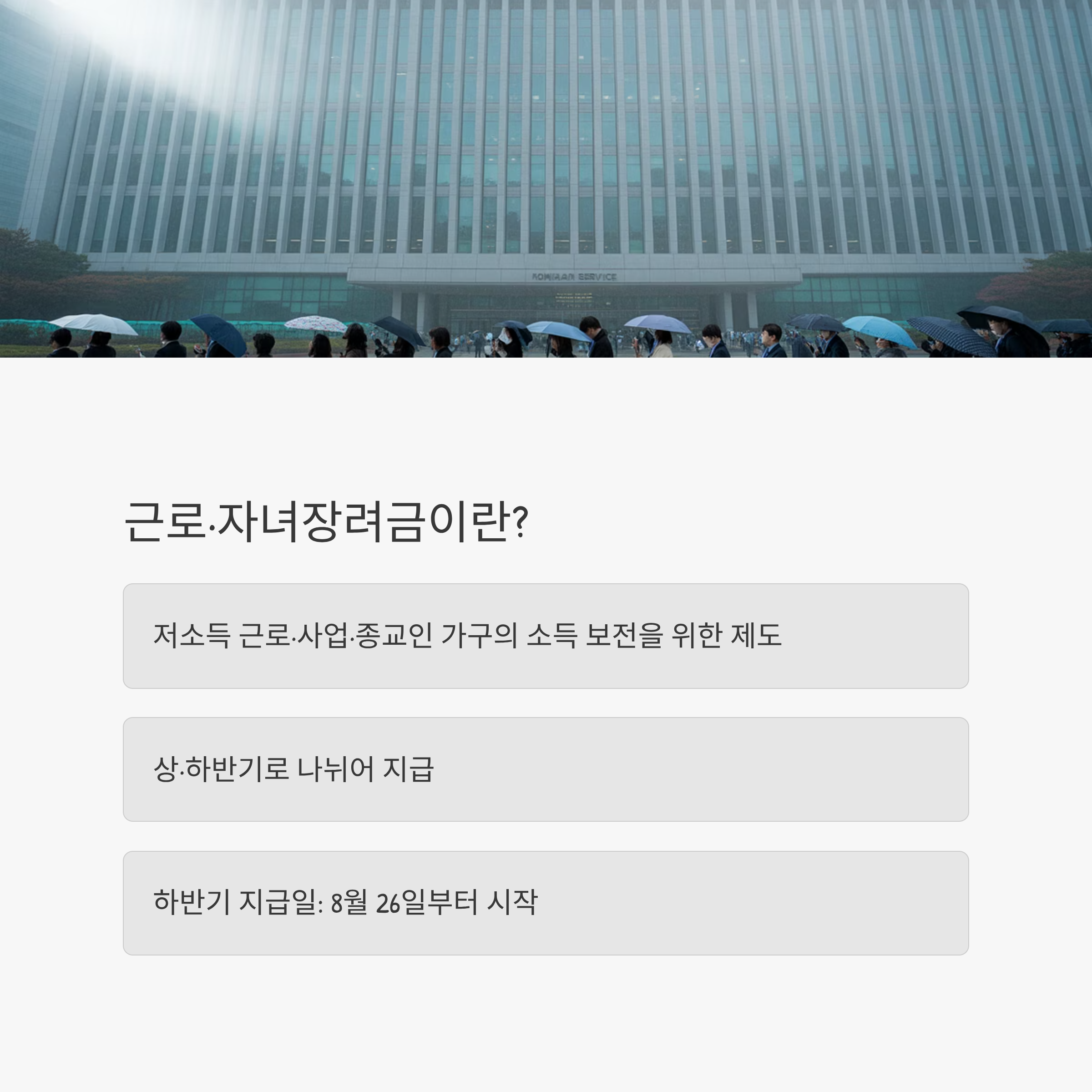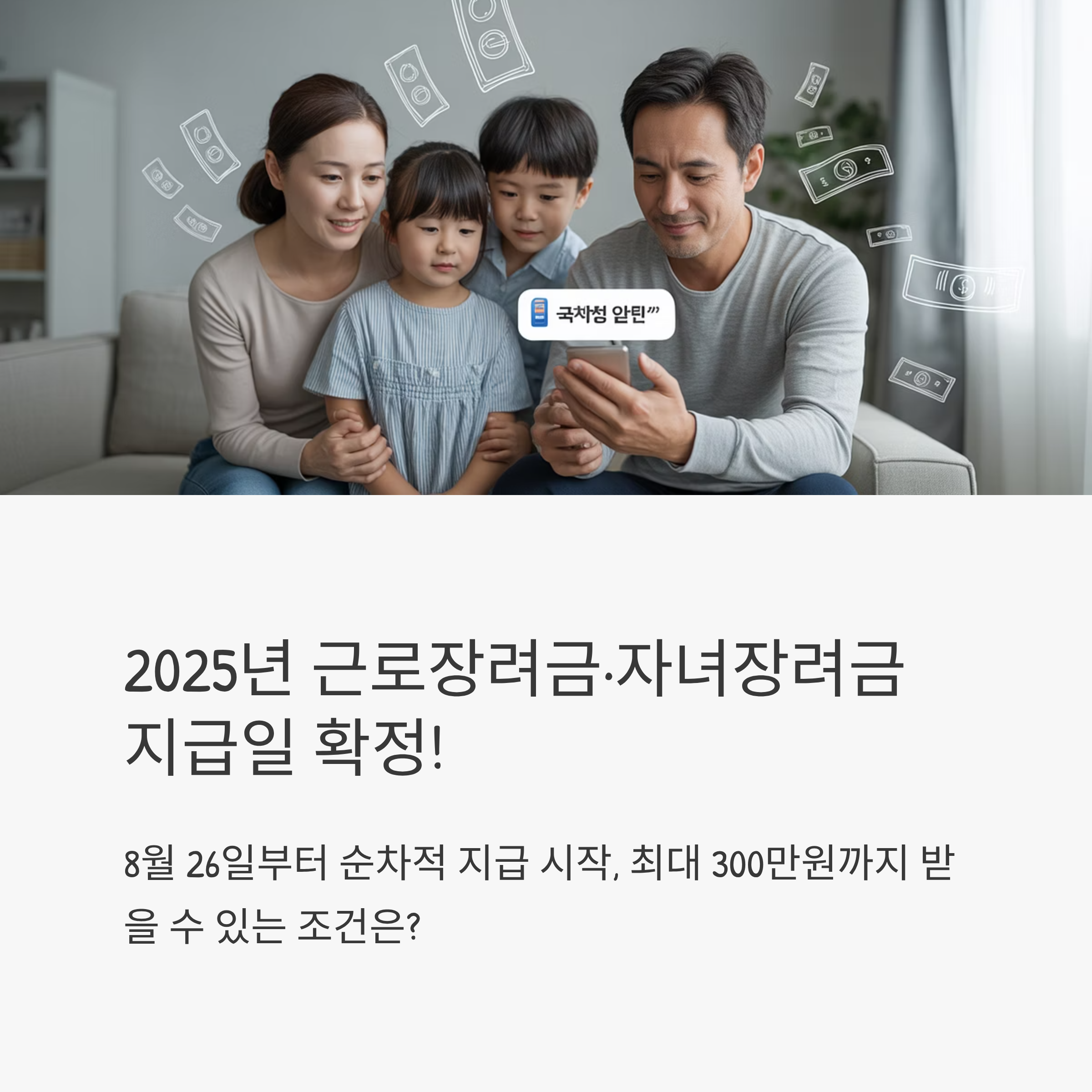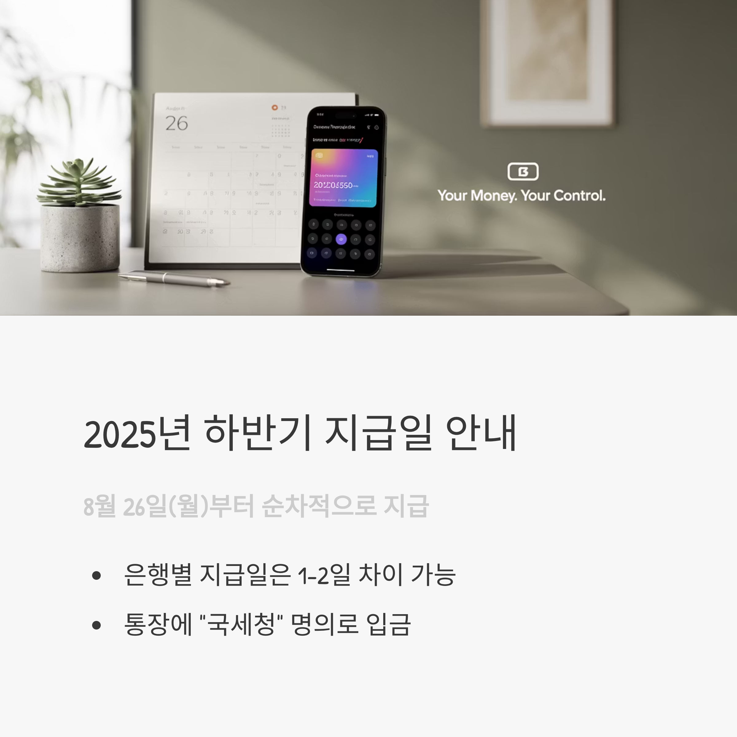 국세청은 2025년 하반기 근로·자녀장려금 지급일을 8월 26일(월)부터 순차적으로 지급한다고 밝혔습니다. 다만 신청자가 많아 은행별 지급일은 하루 이틀 차이가 날 수 있으며, 통장에는 “국세청” 명의로 입금됩니다.