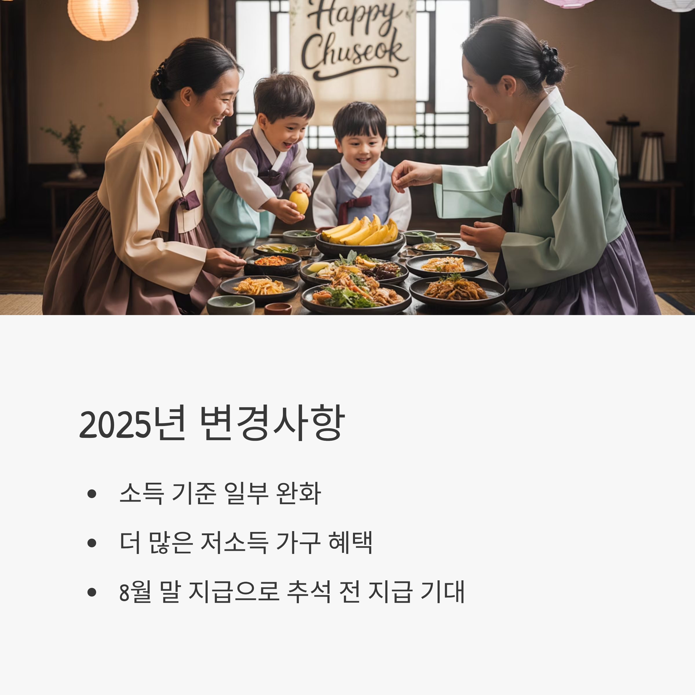 올해는 소득 기준이 일부 완화되어 더 많은 저소득 가구가 혜택을 받을 수 있습니다. 또한 지급 시기가 8월 말로 확정되면서 “추석 전 지급”에 대한 기대감이 높습니다.