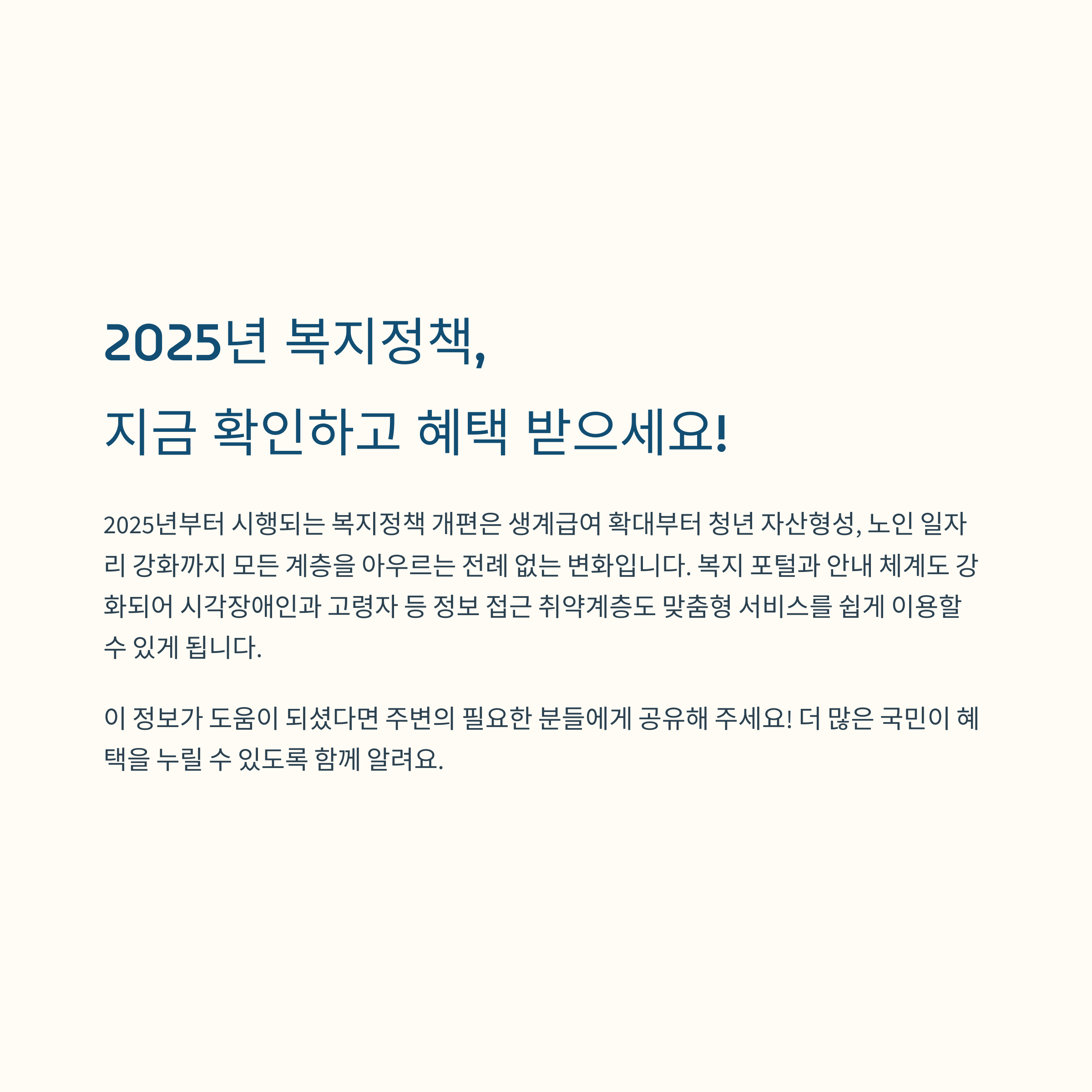 2025년 대한민국 복지정책은 전례 없는 대규모 변화로 국민 삶에 실질적인 영향을 미치게 됩니다. 생계급여 확대부터 청년 자산형성, 노인 일자리 강화까지 모든 계층을 아우르는 이번 정책 개편은 2025년 1월부터 시행되며, 수급 기준 완화와 지원 금액 상승이 핵심입니다. 아래에서는 꼭 확인해야 할 7가지 주요 변화를 정리해 드립니다.