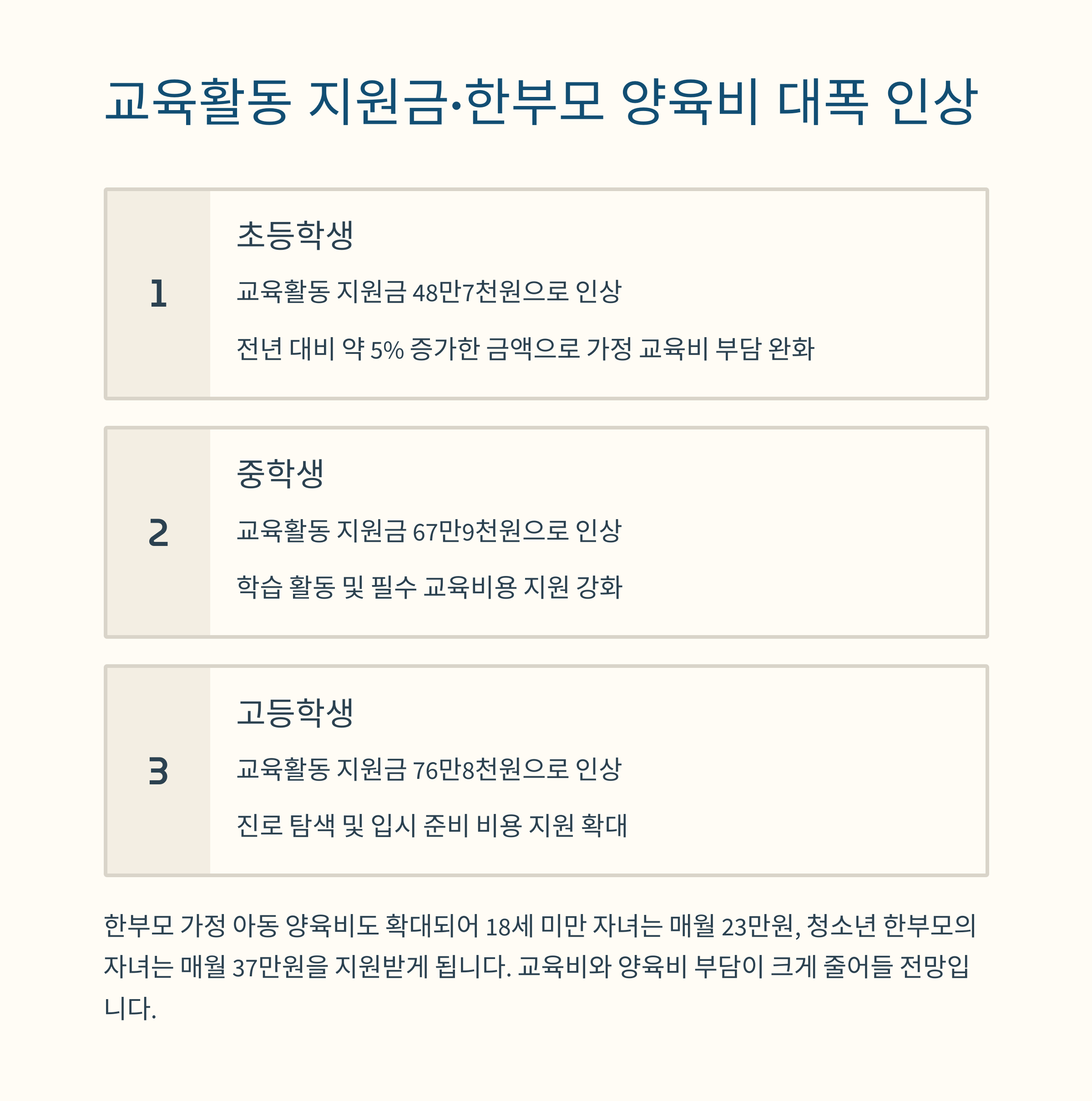 초등학생 48만 7천 원, 중학생 67만 9천 원, 고등학생은 76만 8천 원으로 조정되며