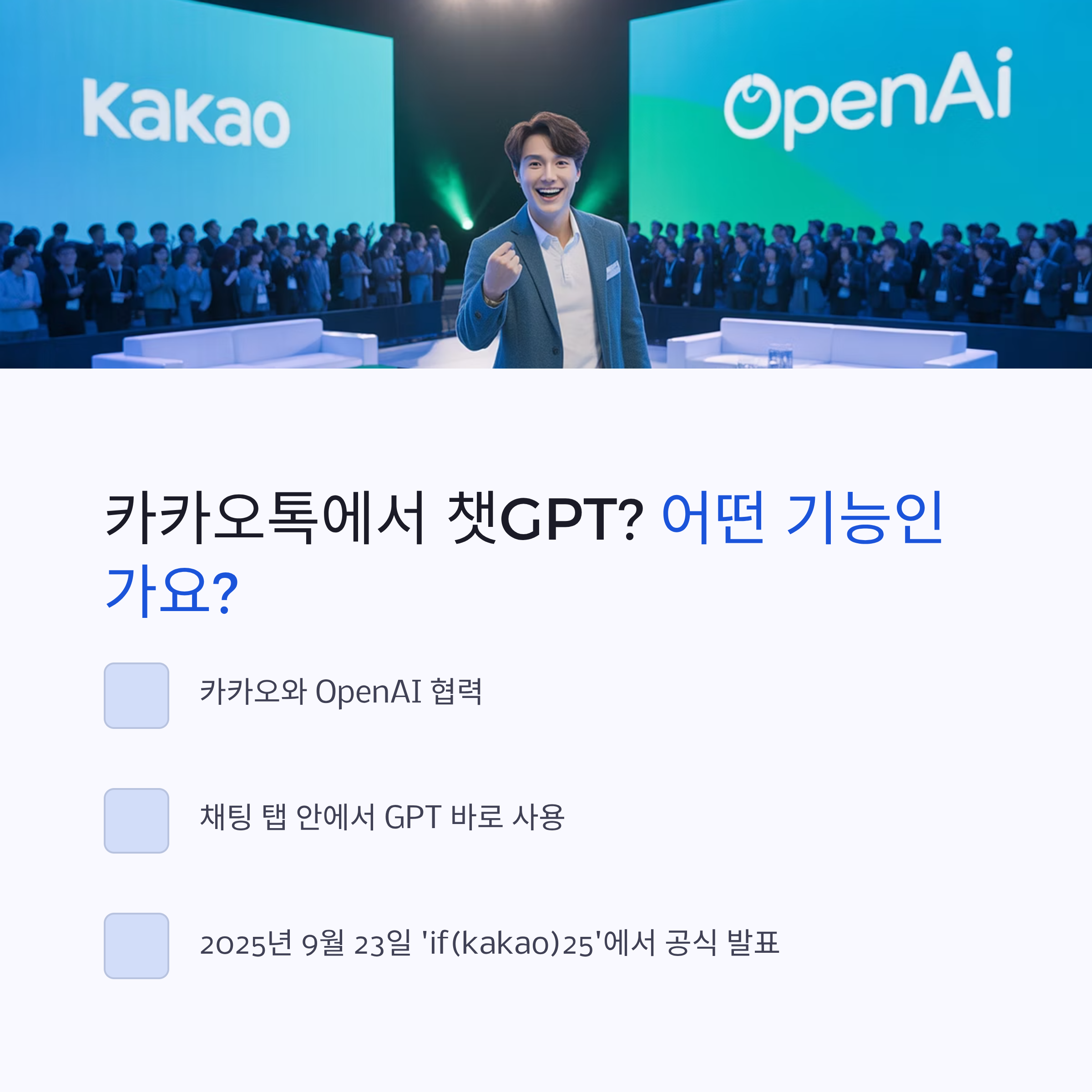 2025년 9월, 카카오톡 안에서 챗GPT를 바로 사용할 수 있는 시대가 열립니다. 기존에는 별도의 앱이나 웹을 이용해야 했지만, 이제는 톡 대화창 안에서 곧바로 AI와 대화할 수 있게 됩니다. 사회복지사분들과 주민들에게 모두 유용한 이 변화, 복지정보 전달과 현장 상담에 어떤 도움이 될지 함께 알아보세요.
