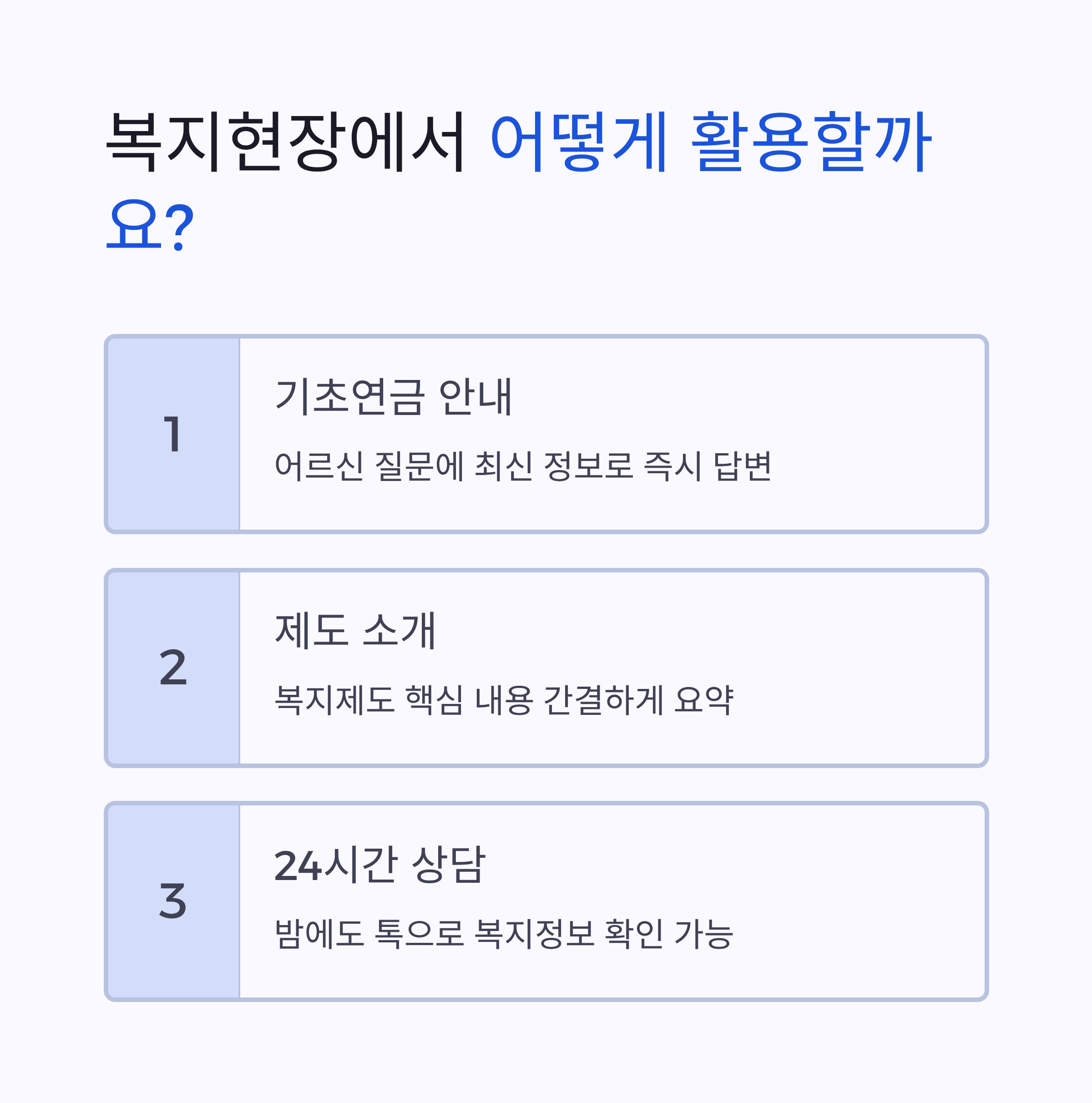 - 실시간 정보 안내: “노인일자리 신청 언제 해요?”라는 질문에 AI가 최신 일정 안내