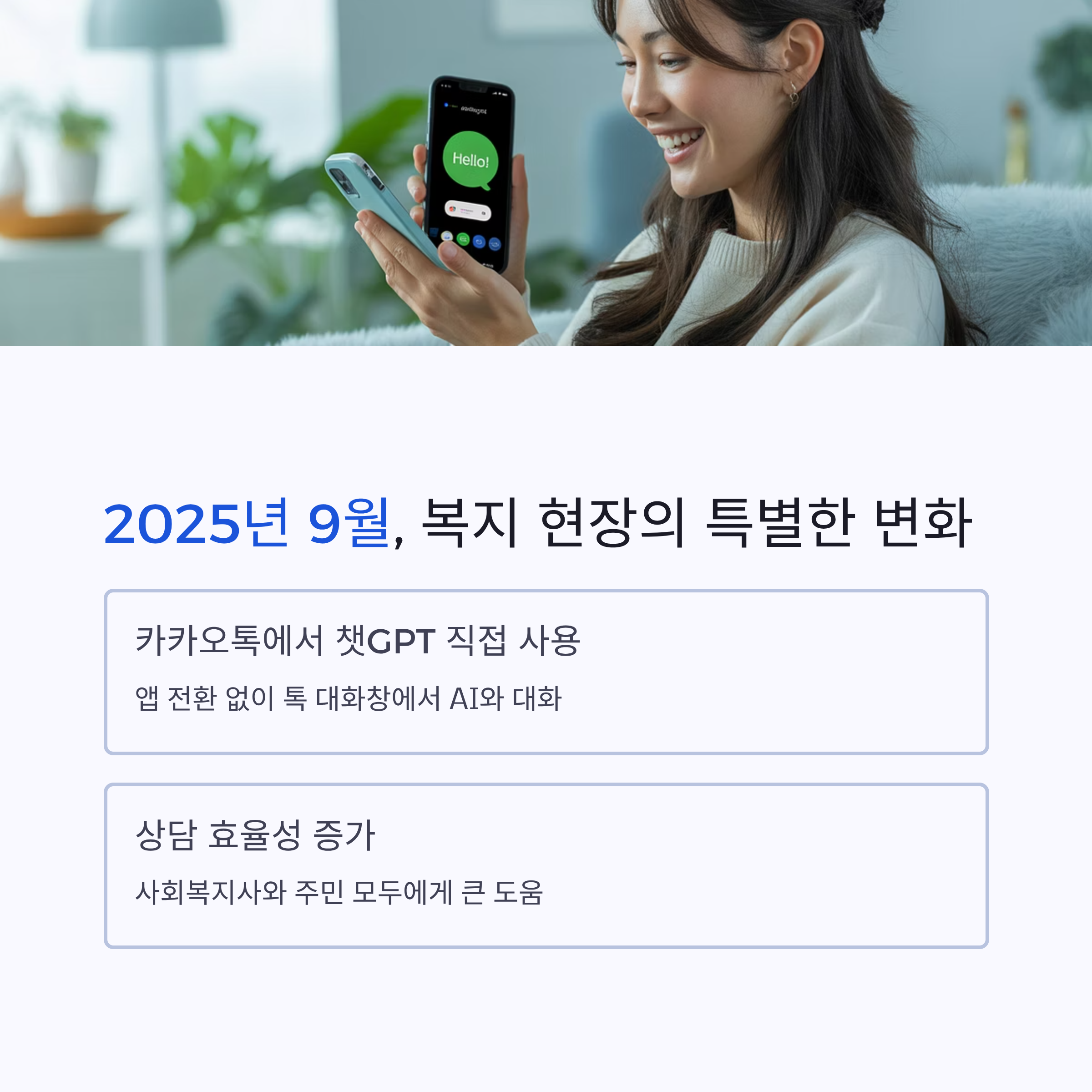 2025년 9월, 카카오톡 안에서 챗GPT를 바로 사용할 수 있는 시대가 열립니다. 기존에는 별도의 앱이나 웹을 이용해야 했지만, 이제는 톡 대화창 안에서 곧바로 AI와 대화할 수 있게 됩니다. 사회복지사분들과 주민들에게 모두 유용한 이 변화, 복지정보 전달과 현장 상담에 어떤 도움이 될지 함께 알아보세요.