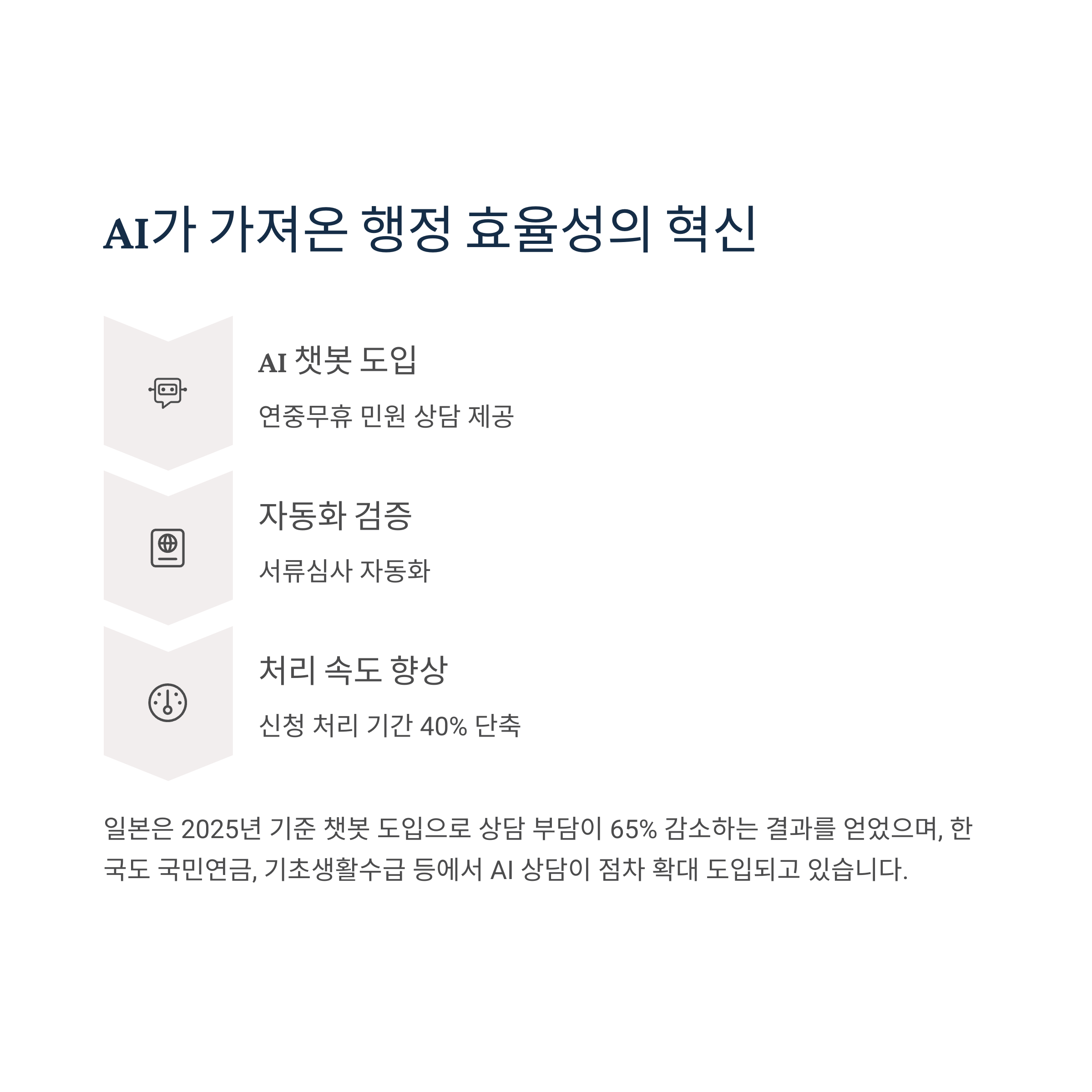 청 처리까지 연중무휴로 지원합니다. 일본은 2025년 기준 챗봇 도입으로 상담 부담이 65% 감소하고, 신청 처리 기간이 40% 단축되는 결과를 얻었습니다. 한국도 국민연금, 기초생활수급 등에서 AI 상담이 점차 확대 도입되고 있습니다.