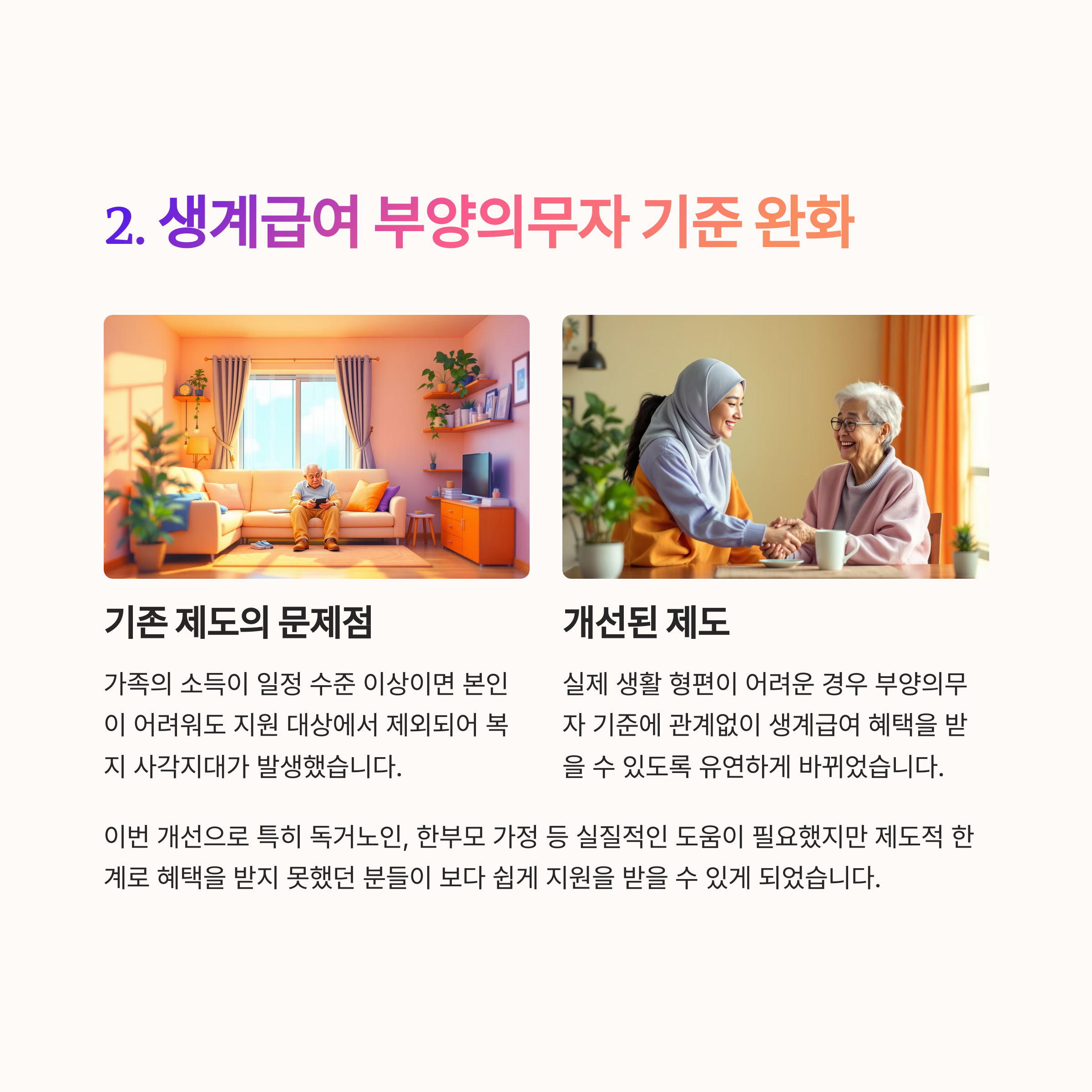복지 사각지대 해소를 위해 부양의무자 기준이 대폭 완화되었습니다.