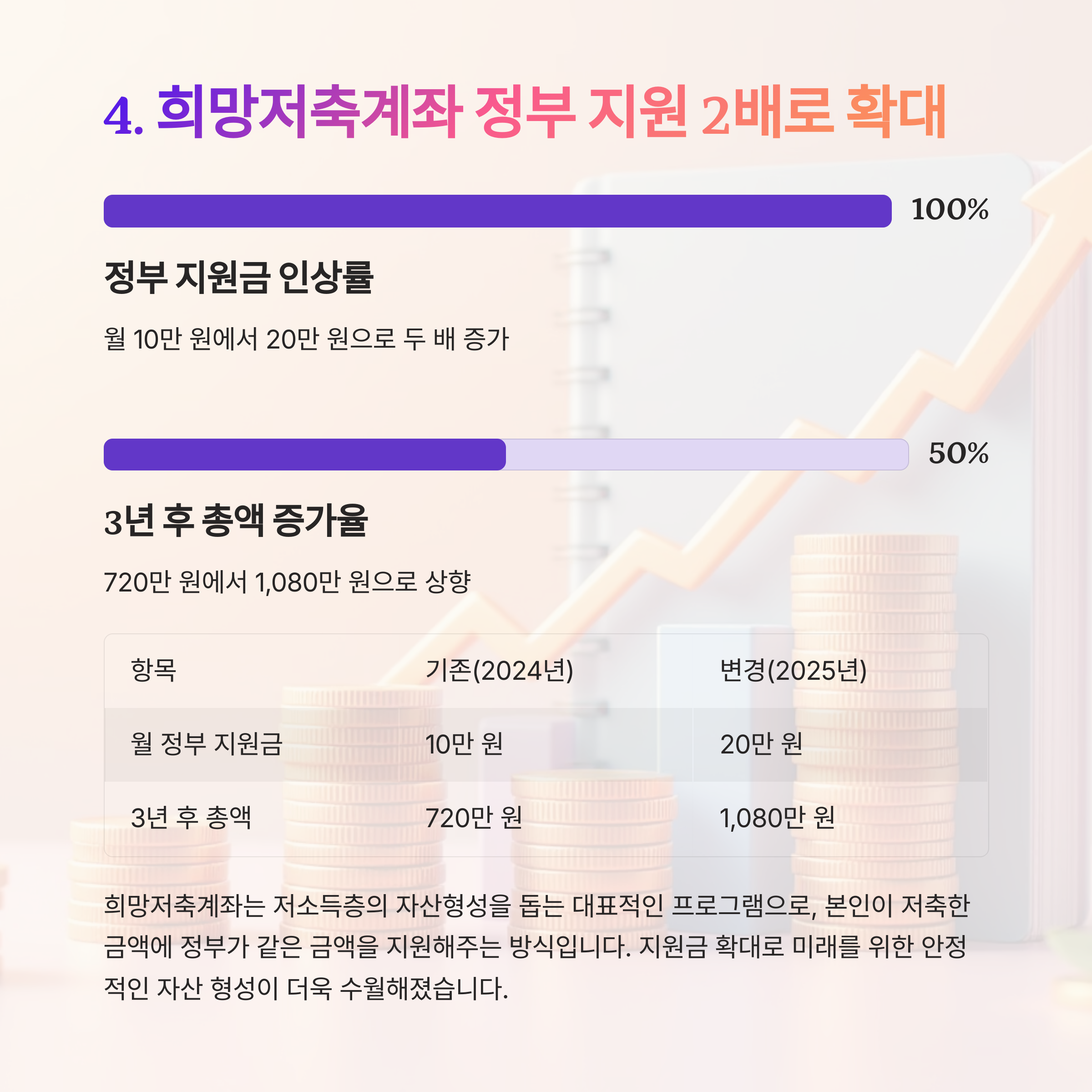 ‘희망저축 계좌’의 정부 지원금이 월 20만 원으로 확대되었습니다.