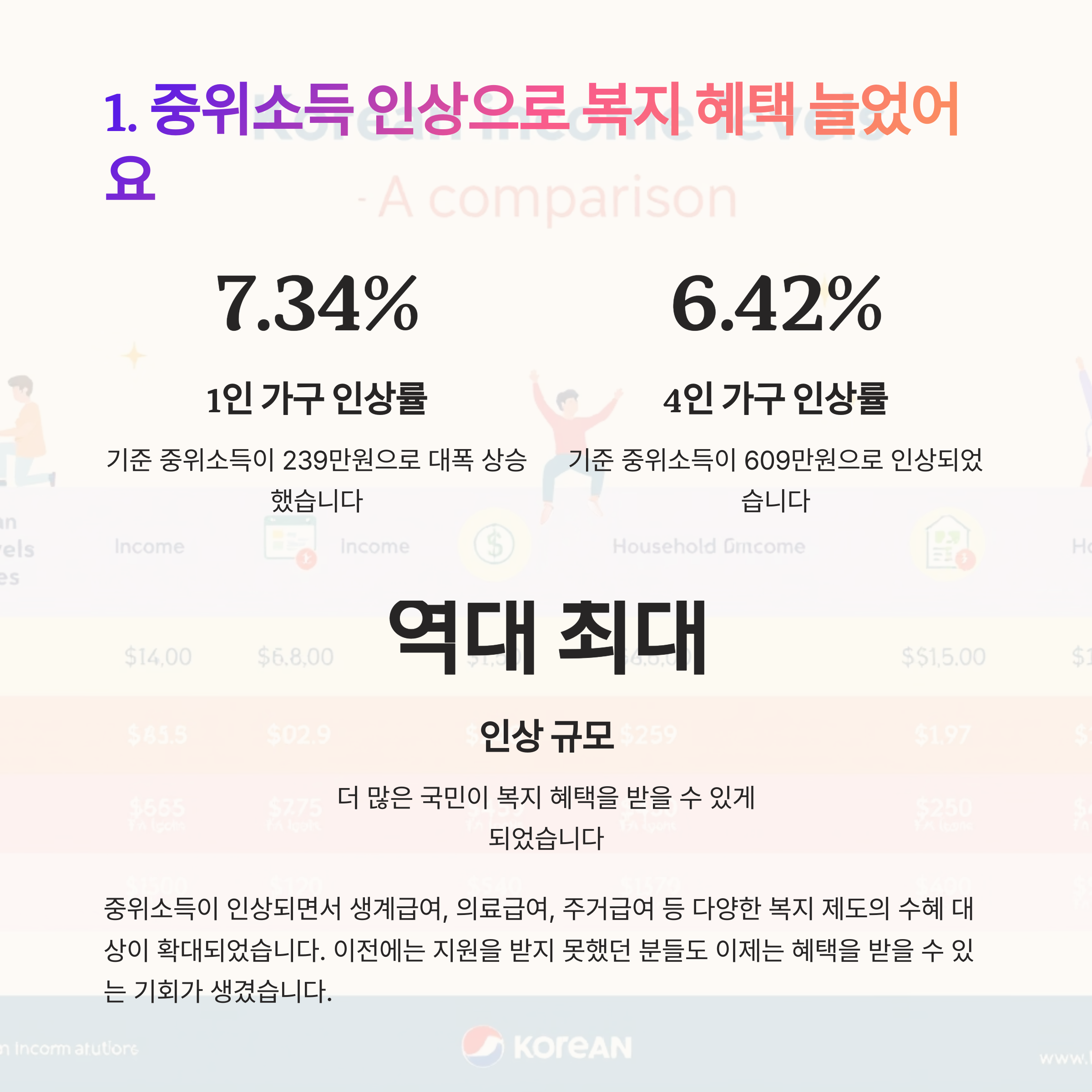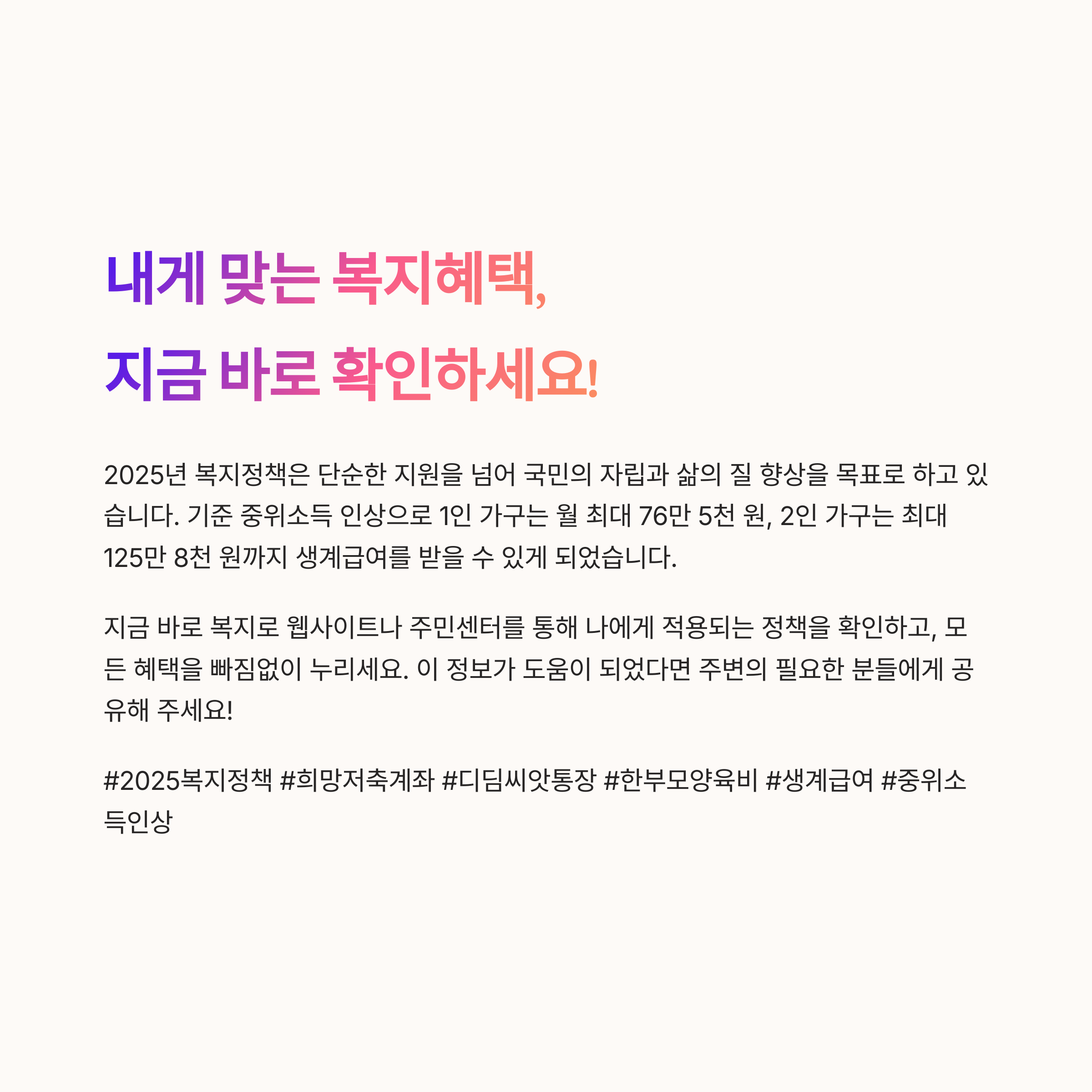 2025년은 복지정책에 있어 큰 전환점이 되는 해입니다. 기준 중위소득 인상으로 지원 대상이 확대되고, 저소득층의 자립과 생활 안정을 돕기 위한 맞춤형 정책들이 다양하게 마련되었습니다. 이번 글에서는 복잡해 보일 수 있는 정책들을 누구나 이해하기 쉽도록 핵심만 정리해 드립니다.