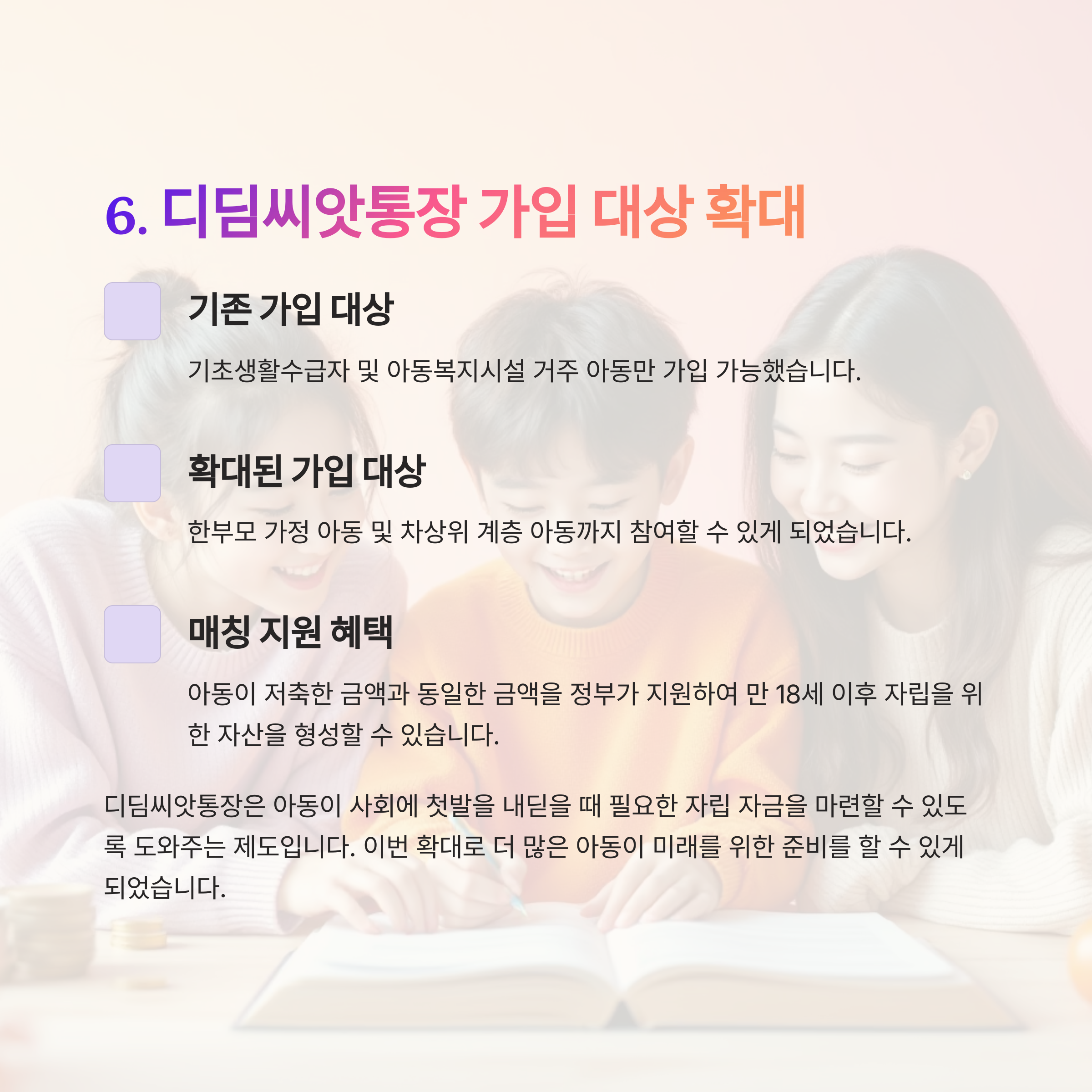 자립 준비 아동을 위한 ‘디딤씨앗통장’ 가입 대상이 확대되었습니다.