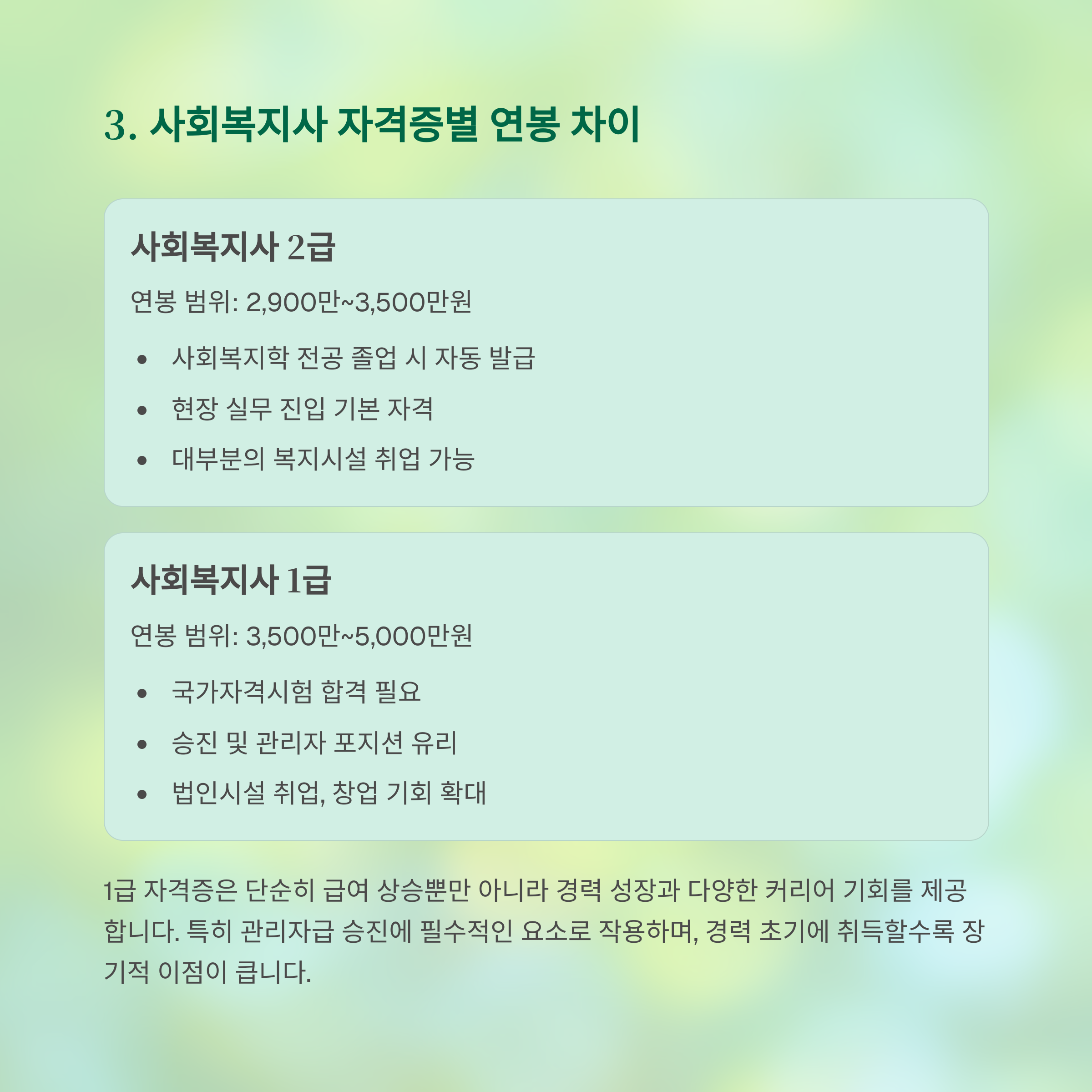 | 사회복지사 1급 | 3,500만~5,000만 원 | 국가자격시험 합격 필요 |