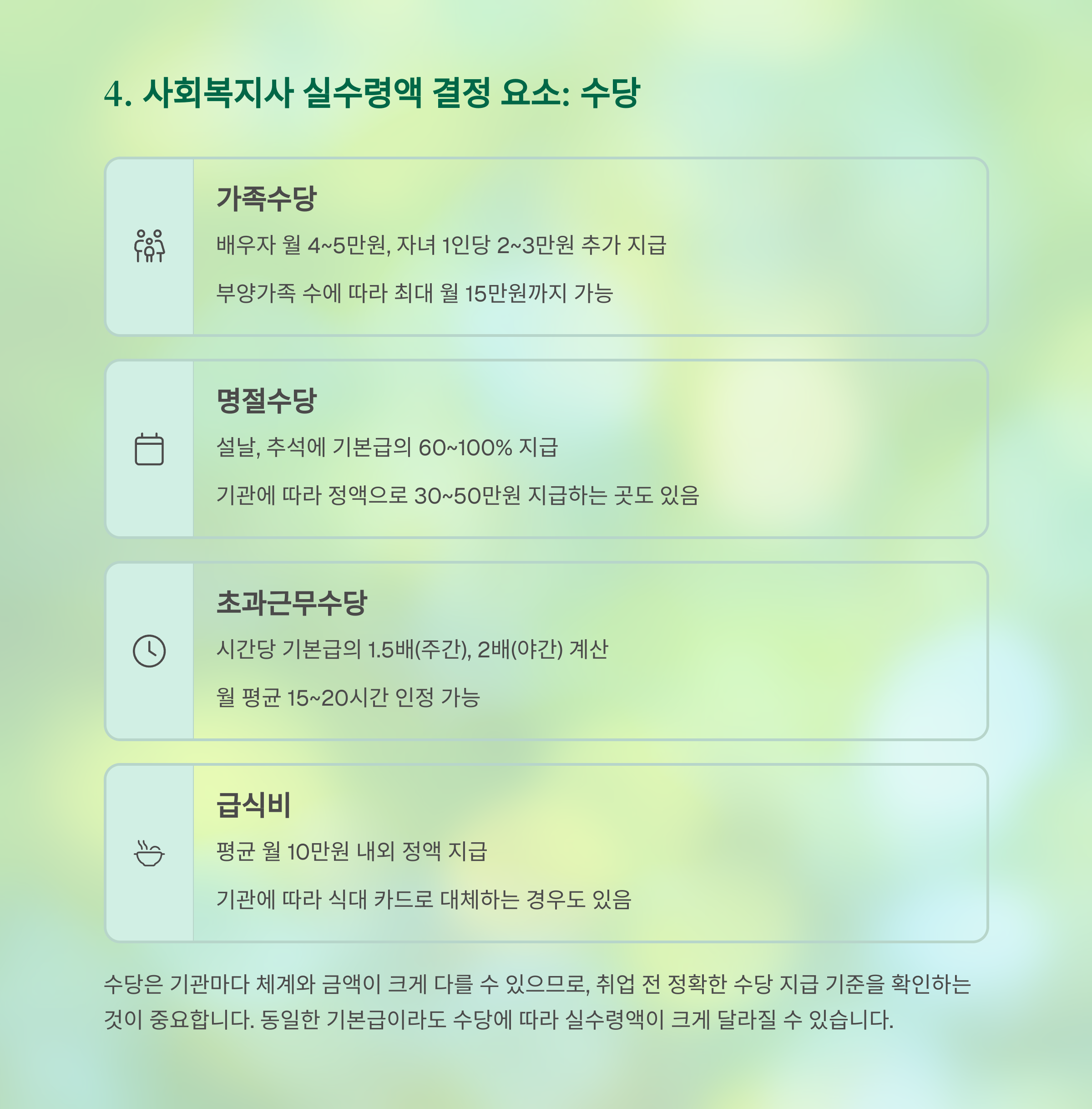 사회복지사는 기본급 외 다양한 수당을 받습니다.