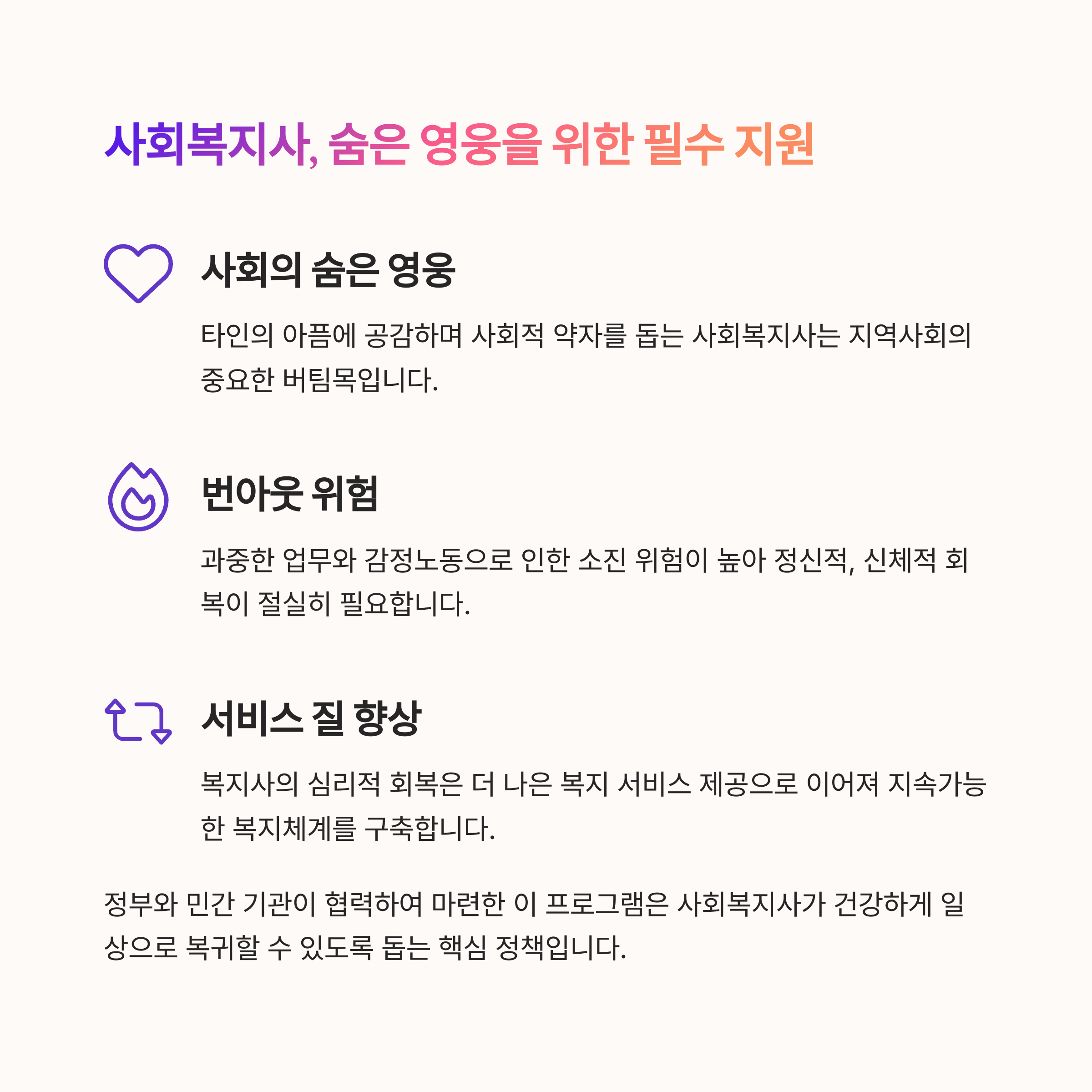 이 프로그램은 사회복지사의 건강한 일상 복귀를 돕기 위한