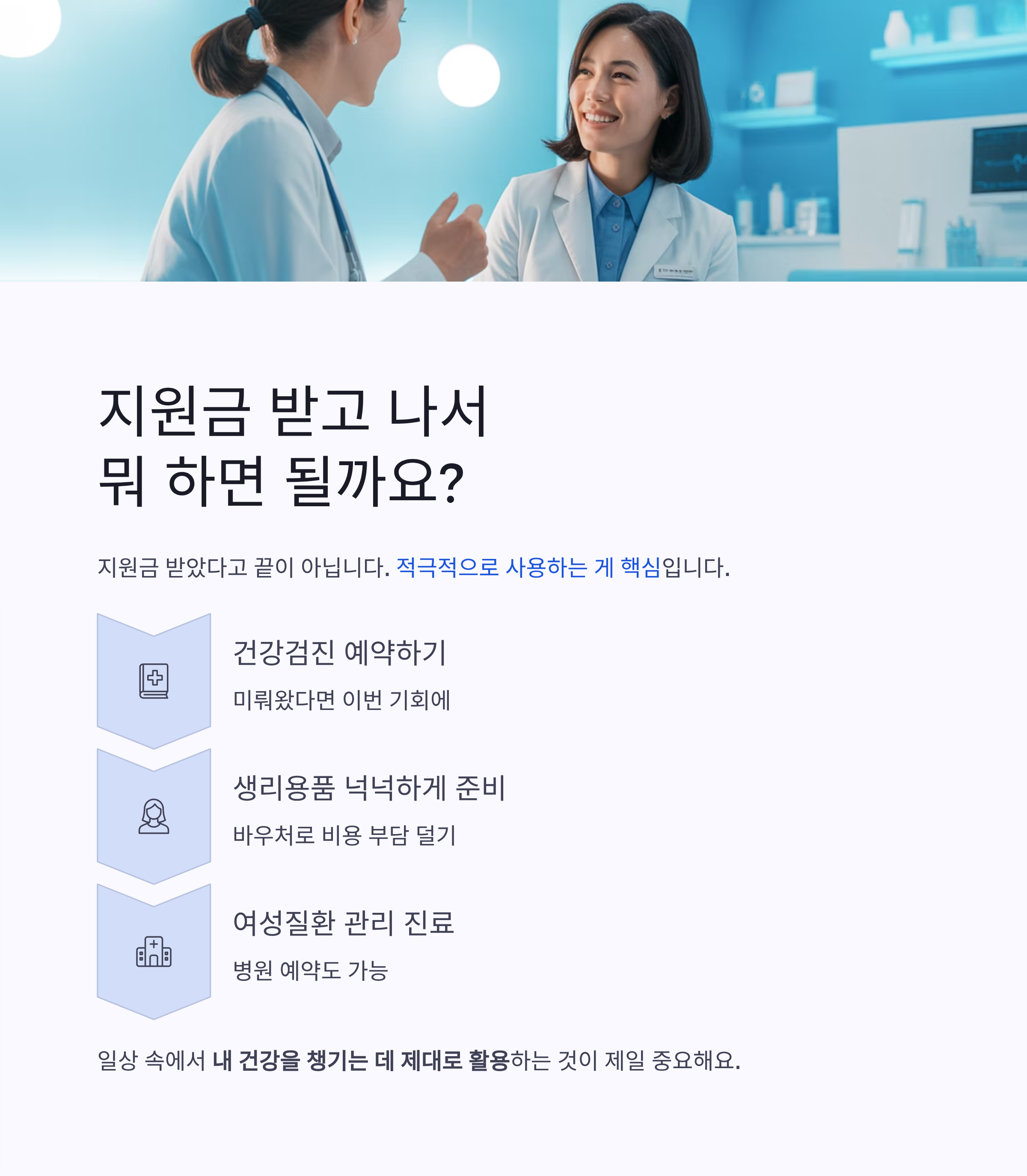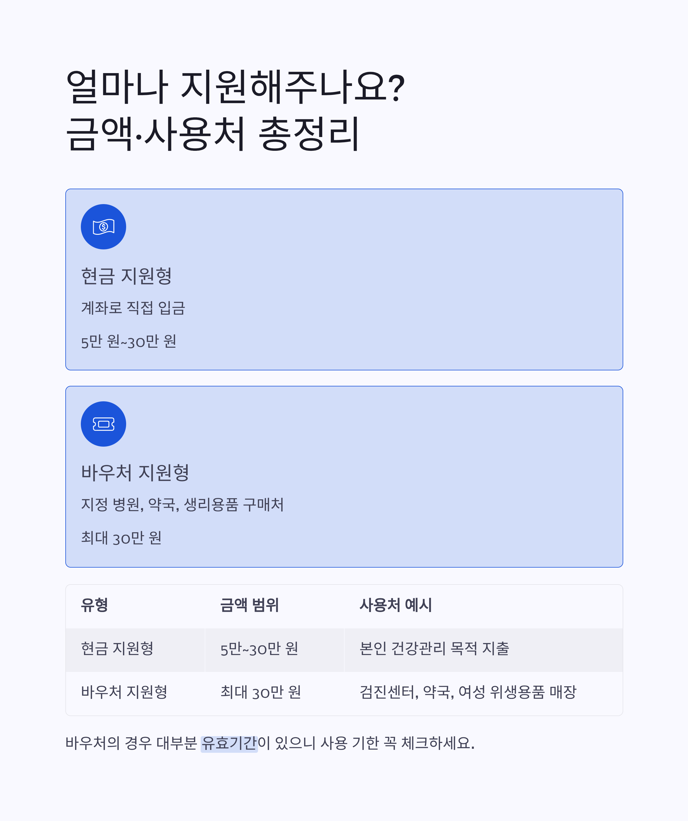 | 바우처 지원형 | 최대 30만 원 | 검진센터, 약국, 여성 위생용품 매장 |