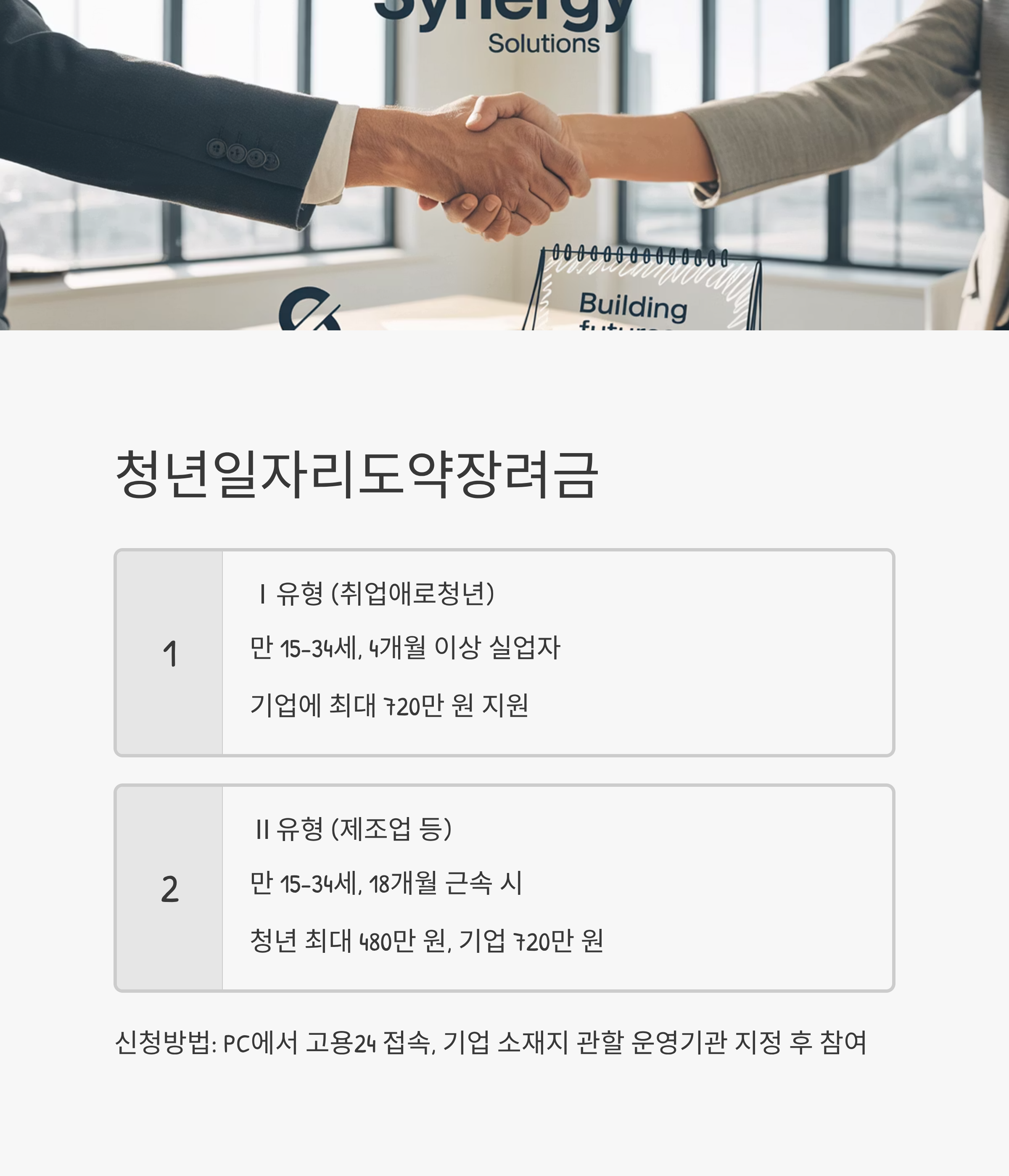 | 청년일자리도약장려금 | 청년 + 중소기업 | 기업 최대 720만 원, 청년 최대 480만 원 | 고용24 PC에서 신청 |