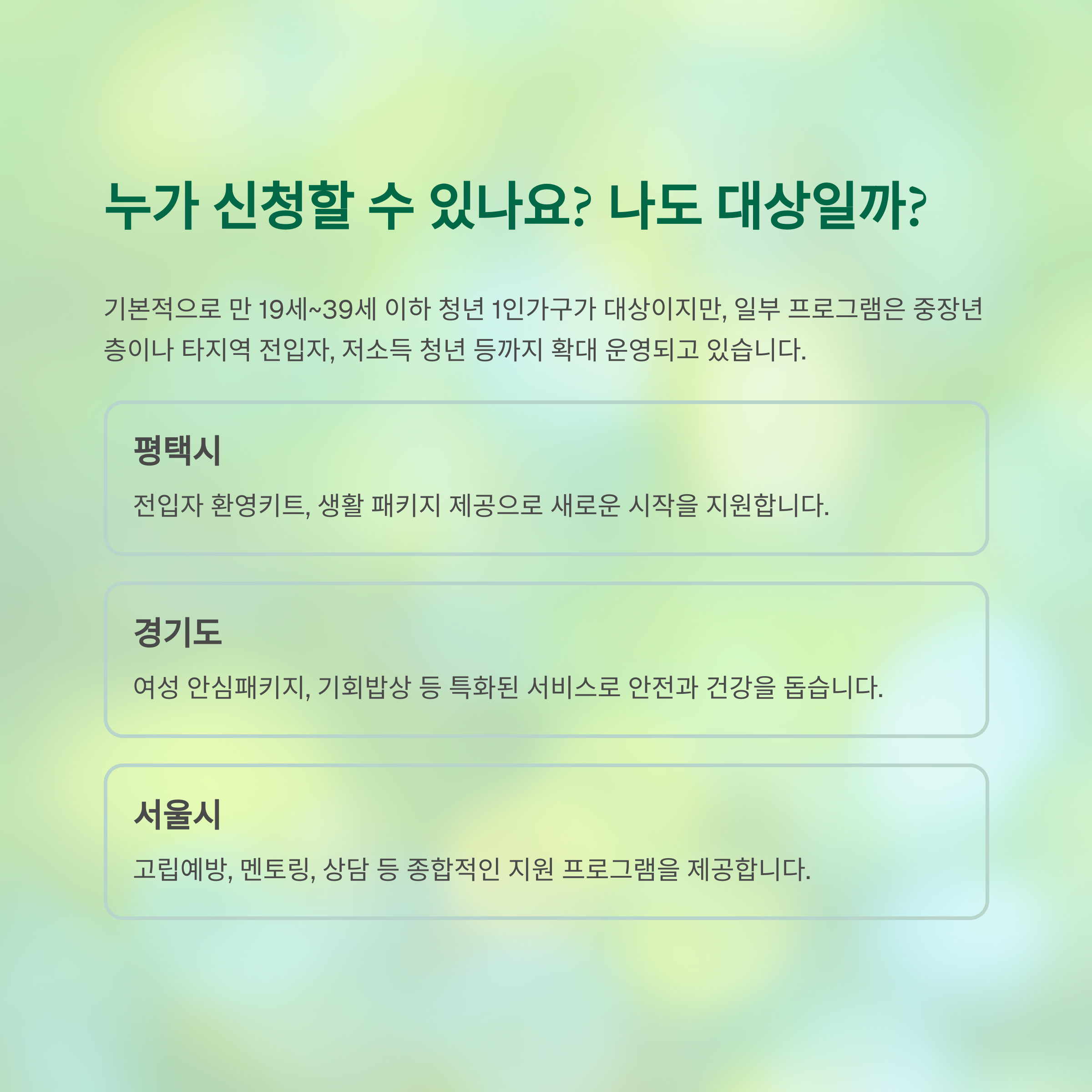지원 대상은 기본적으로 만 19세~39세 이하 청년 1인가구입니다. 다만, 일부 프로그램은 중장년 1인가구나 타 지역 전입자, 저소득 청년 등까지 확대 운영되고 있습니다. 특히 경기도는 여성 1인가구를 위한 안심패키지, 건강 돌봄 서비스, 식사지원 등도 함께 시행하고 있습니다.