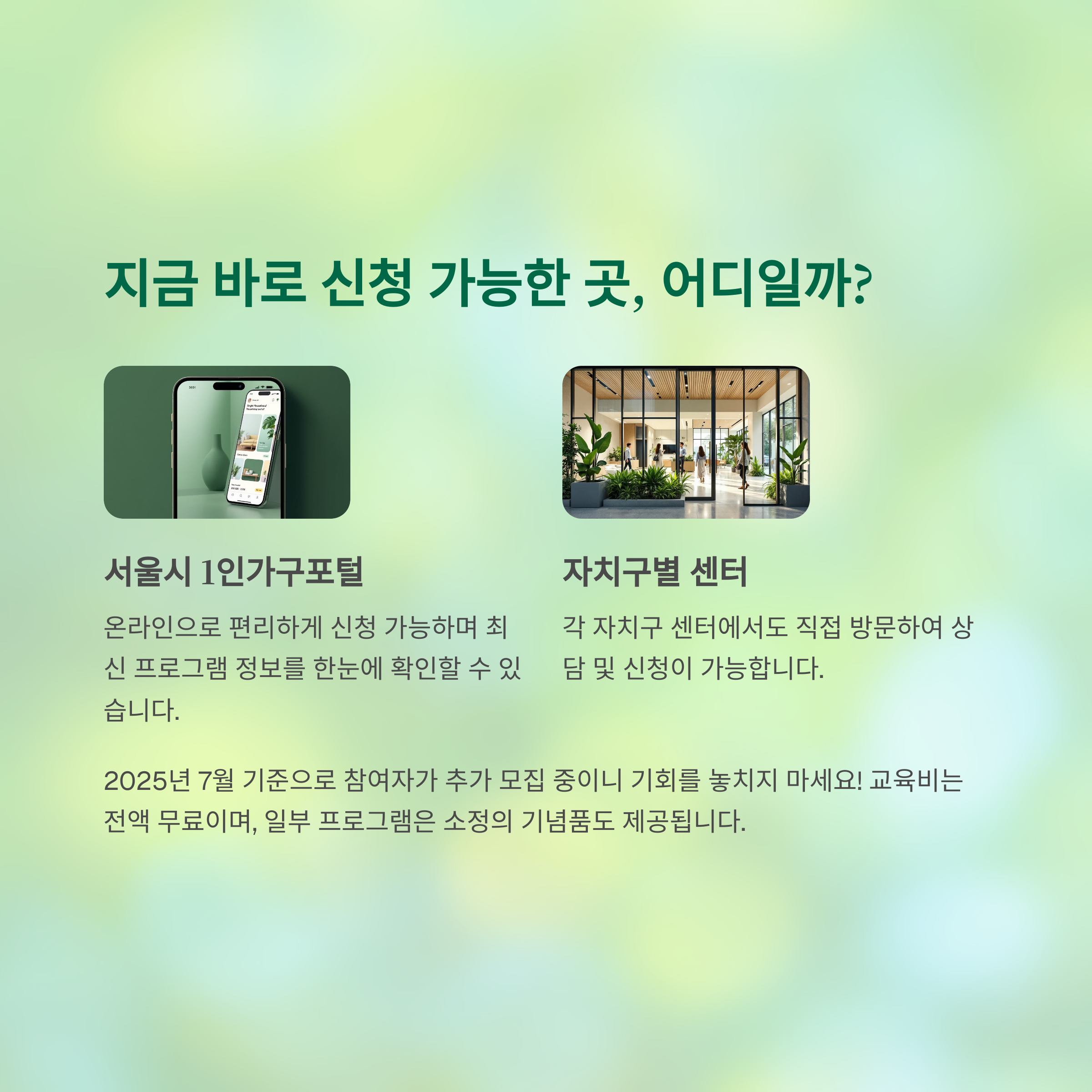서울시 1인가구포털 또는 자치구별 센터 홈페이지에서 온라인 신청이 가능합니다. 현재 2025년 7월 기준으로도 참여자가 추가 모집 중이니, 아직 기회를 놓치지 마세요. 교육비는 전액 무료이며, 일부 프로그램은 소정의 기념품도 제공됩니다.