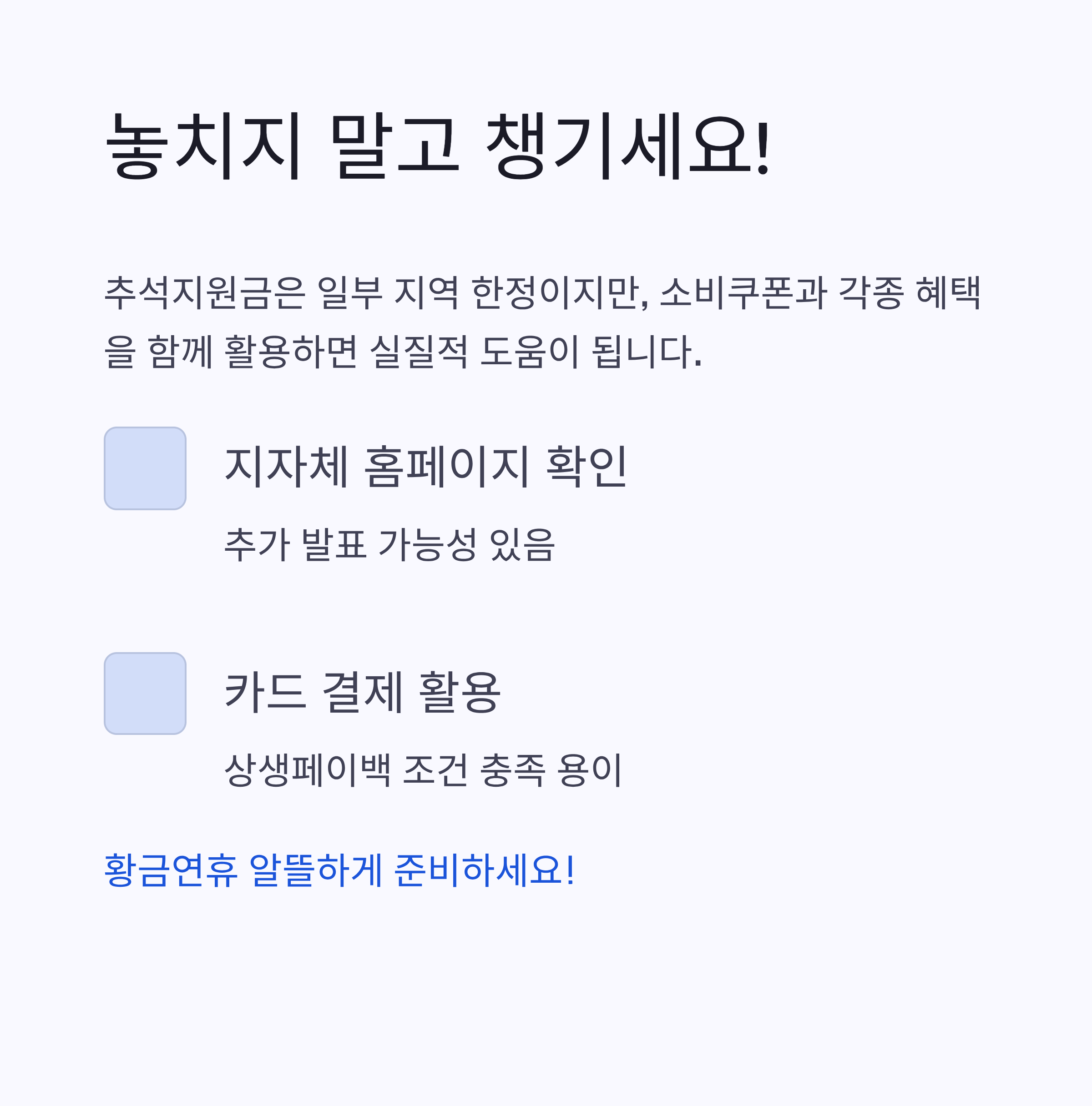 다가올 황금연휴, 추석지원금과 각종 제도를 알뜰하게 챙기셔서 생활에 보탬이 되시길 바랍니다.