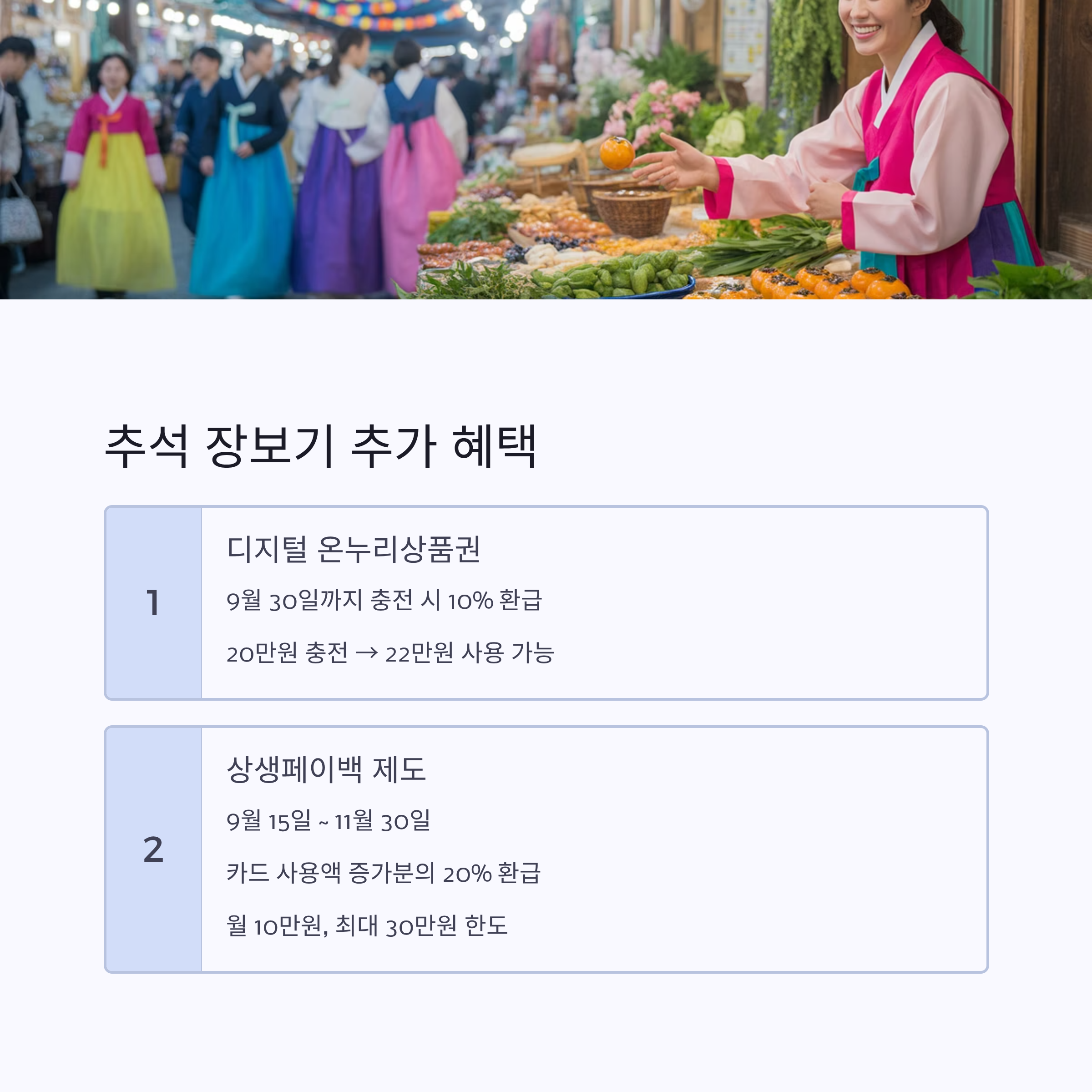 👉 추석 장보기를 카드로 결제하면 소비액이 늘어나 환급 조건 충족이 더 쉽습니다.