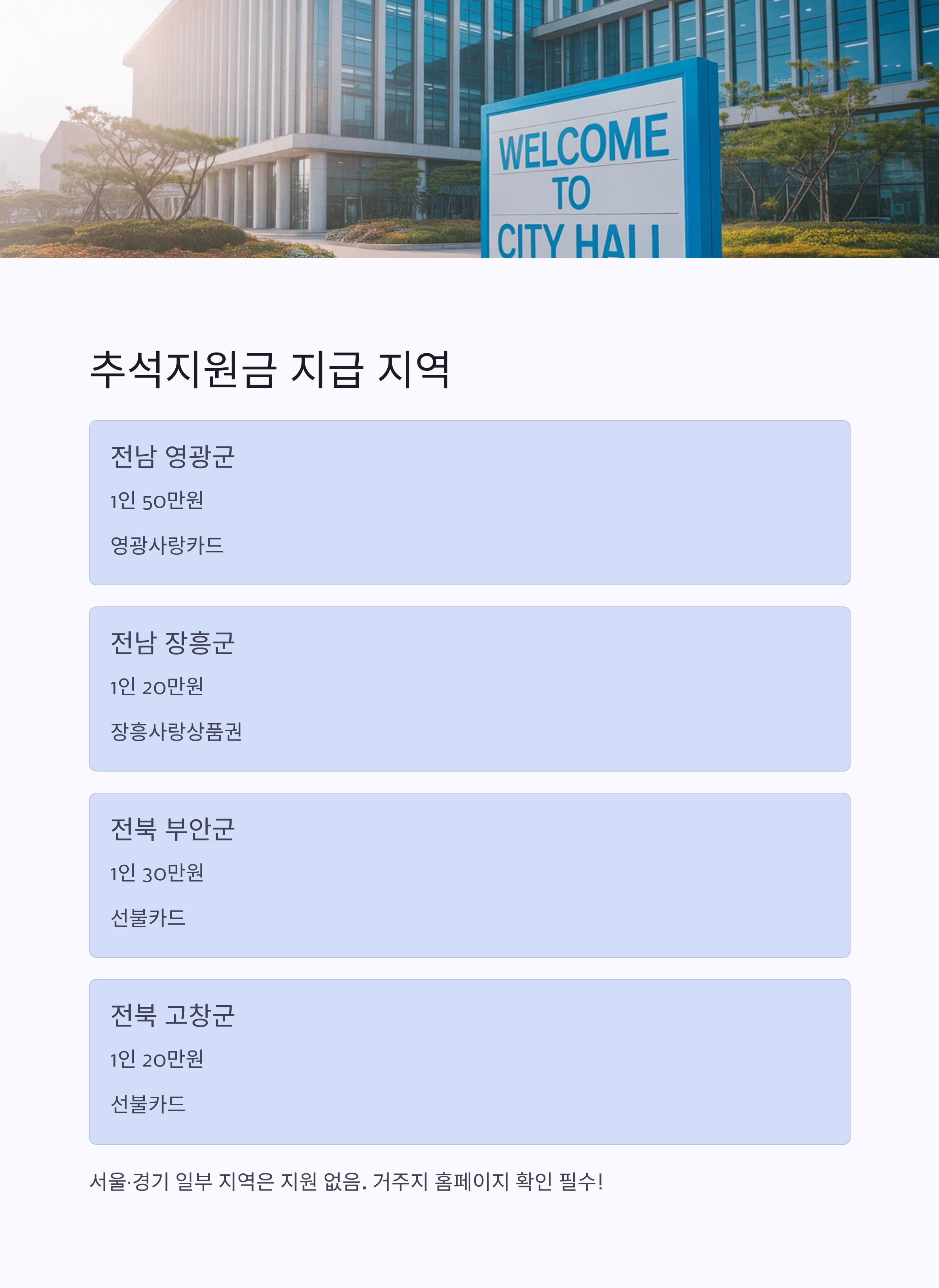 | 전북 부안군 | 1인 30만 원 | 선불카드 | 9/15 전후 지급 시작 | 군민, 결혼이민자·영주권자 포함 |