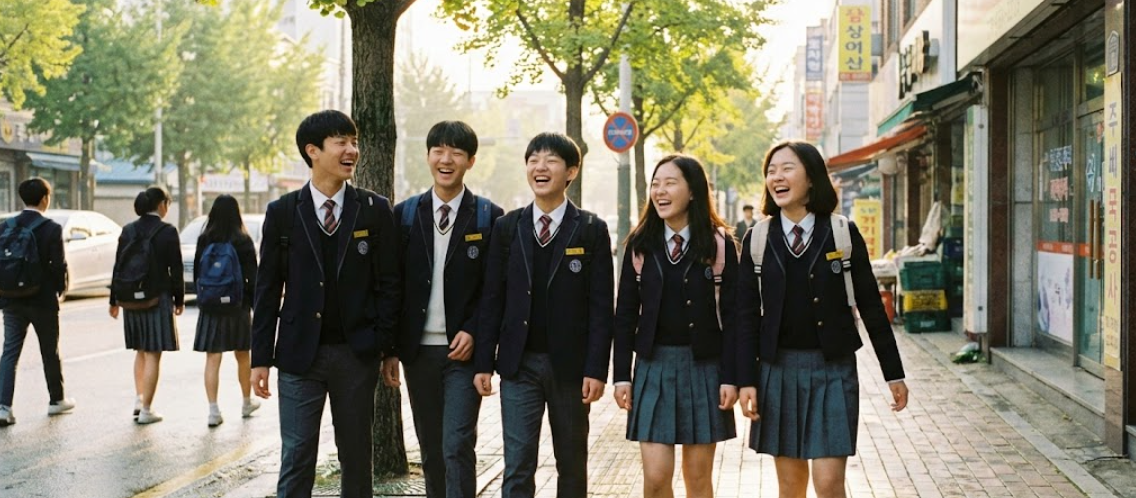교복을 입고 환하게 웃는 중학생들