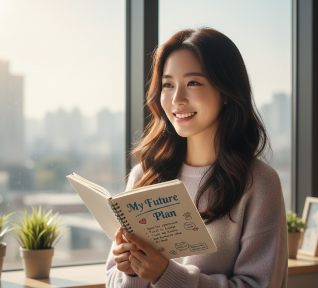 밝은 미소를 짓는 청년이 미래 계획을 적은 노트를 들고 있는 모습