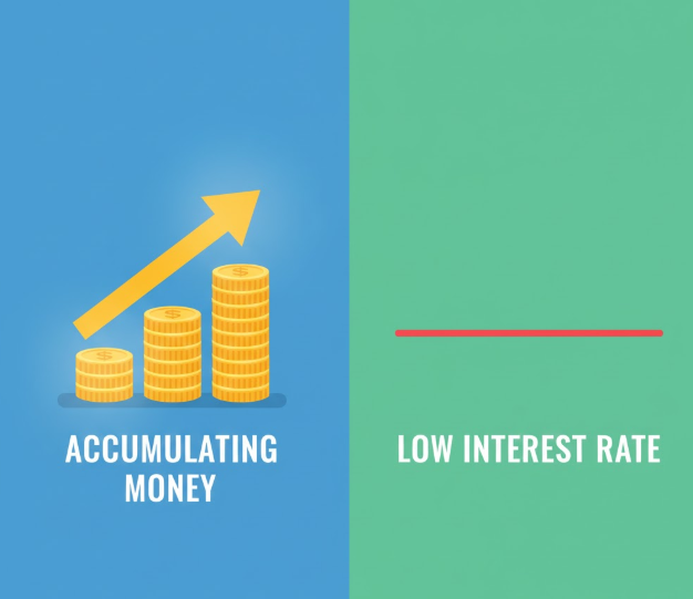 낮은 이자율 그래프와 돈이 모이는 모습을 보여주는 아이콘
