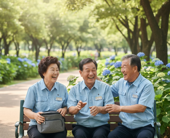 [이미지 6: 공원에서 동료들과 즐겁게 대화하며 휴식 중인 시니어 근로자들]