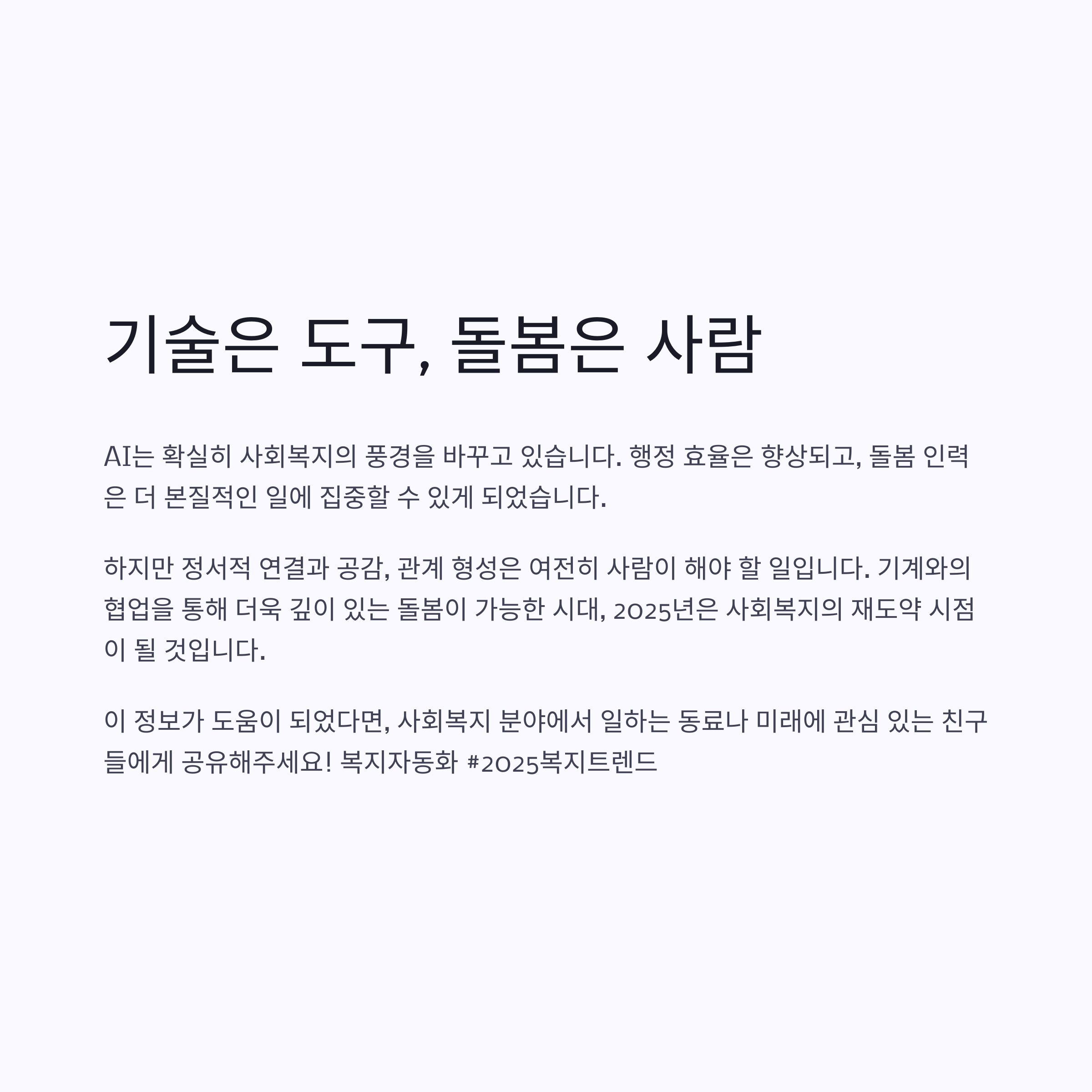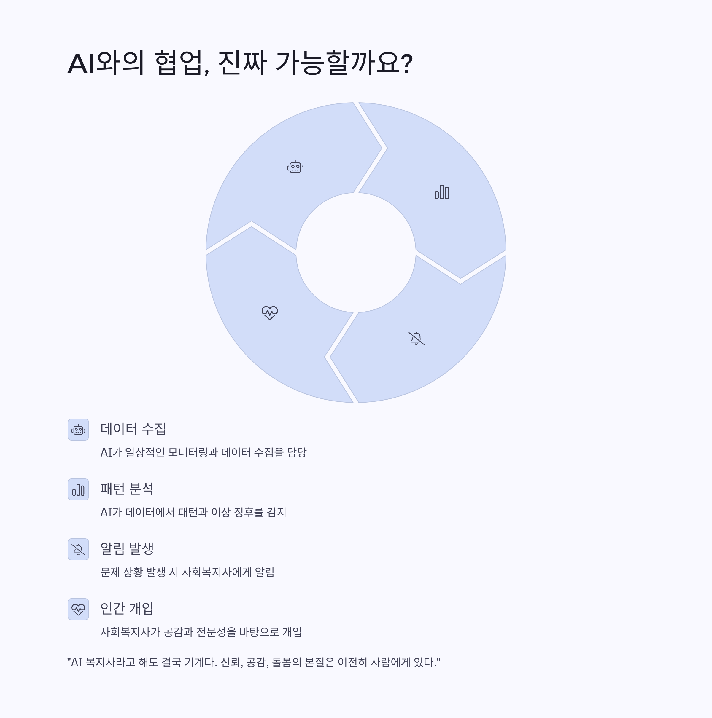 AI 복지사는 도구일 뿐, 인간을 대체하지 못합니다.