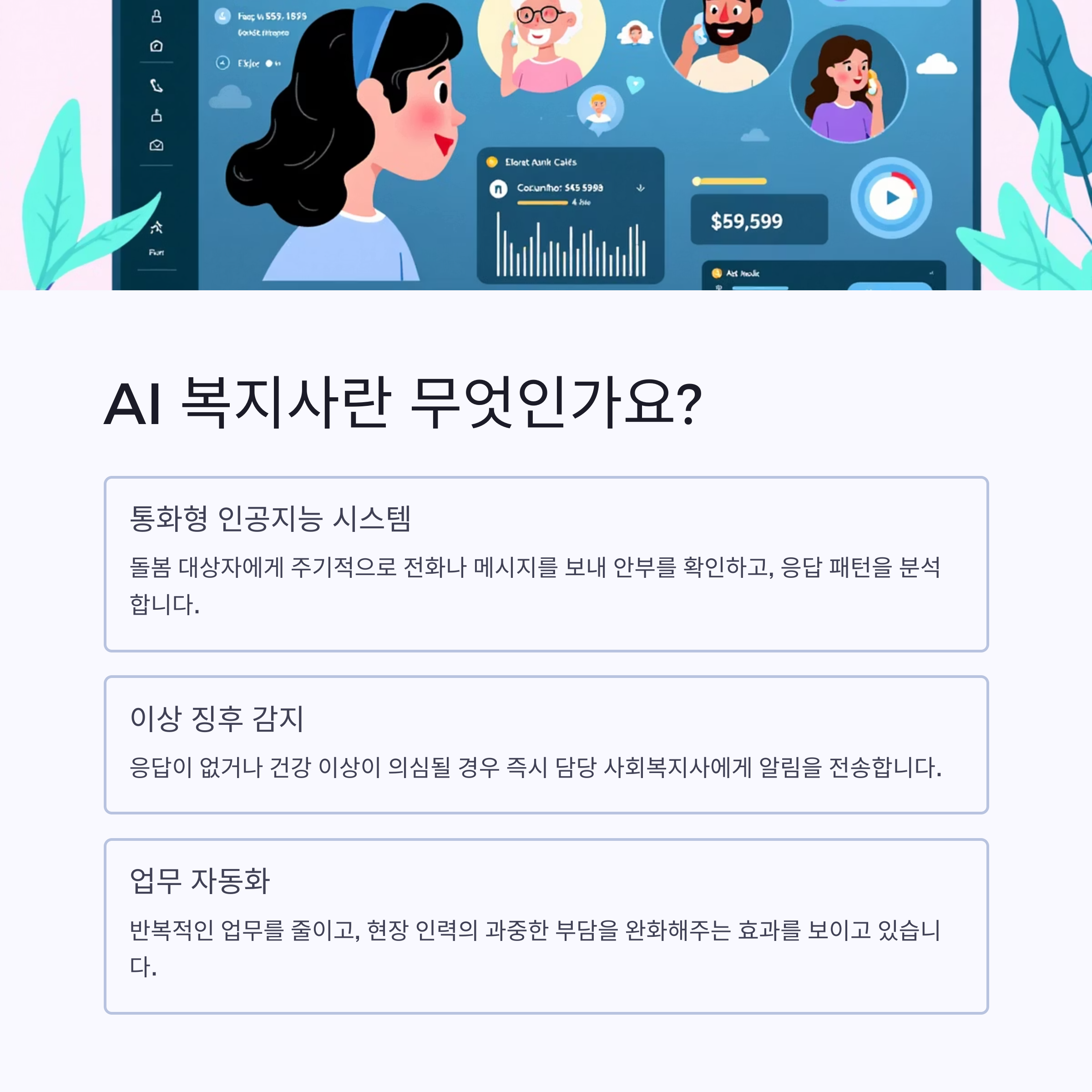 AI 복지사는 통화형 인공지능 기반 시스템으로, 돌봄 대상자에게 주기적으로 전화나 메시지를 보내 안부를 확인하고, 이상 징후를 자동으로 감지해 경보를 울리는 역할을 합니다. 예를 들어, 응답이 없거나 건강 이상이 의심될 경우 즉시 담당 사회복지사에게 알림이 전송됩니다.