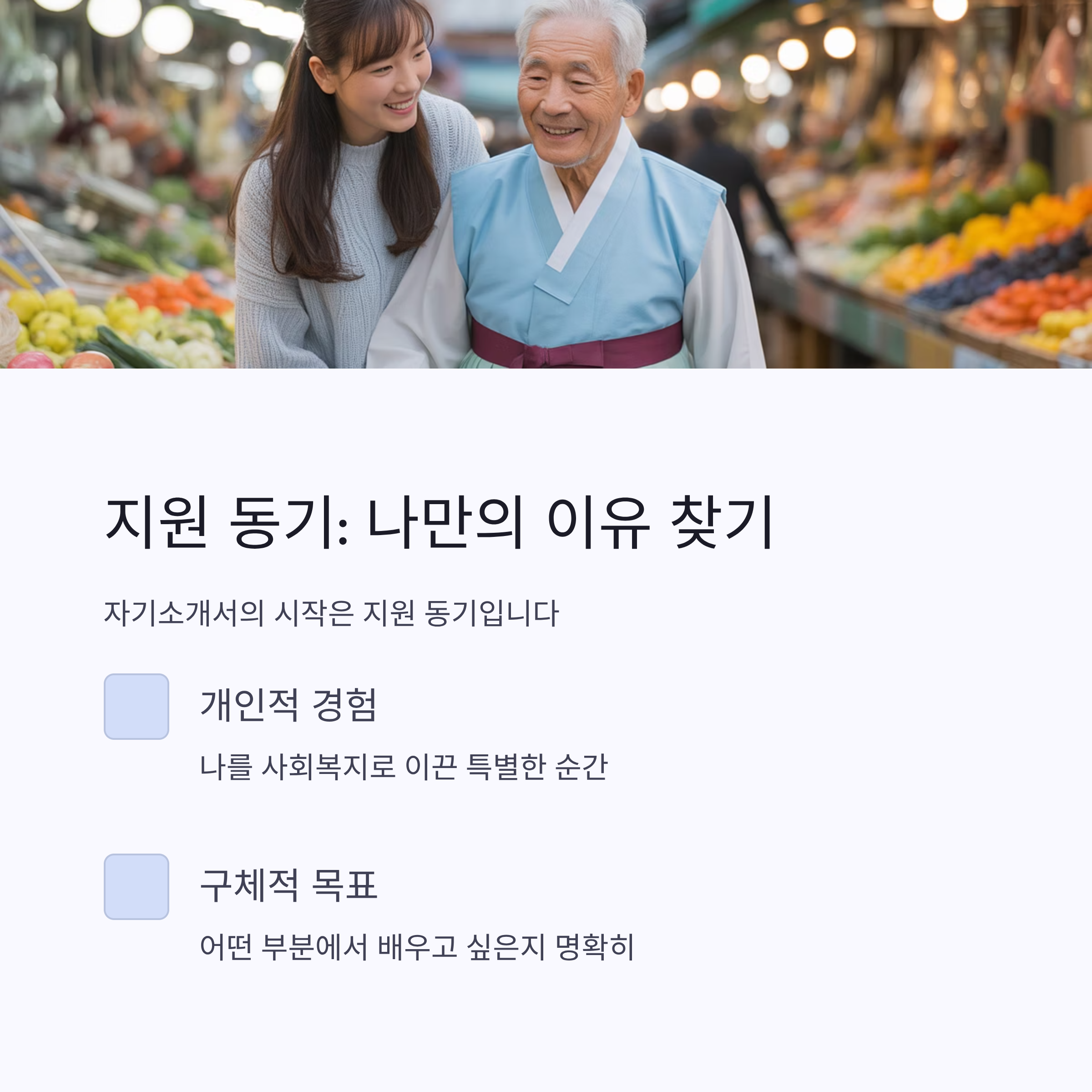 자기소개서의 시작은 지원 동기입니다. 여기서 중요한 건 '나만의 이유'예요. 단순히 관심이 있어서가 아니라 어떤 경험이 나를 사회복지라는 길로 이끌었는지, 또 어떤 부분에서 배우고 싶은지 솔직하게 적는 게 좋습니다.