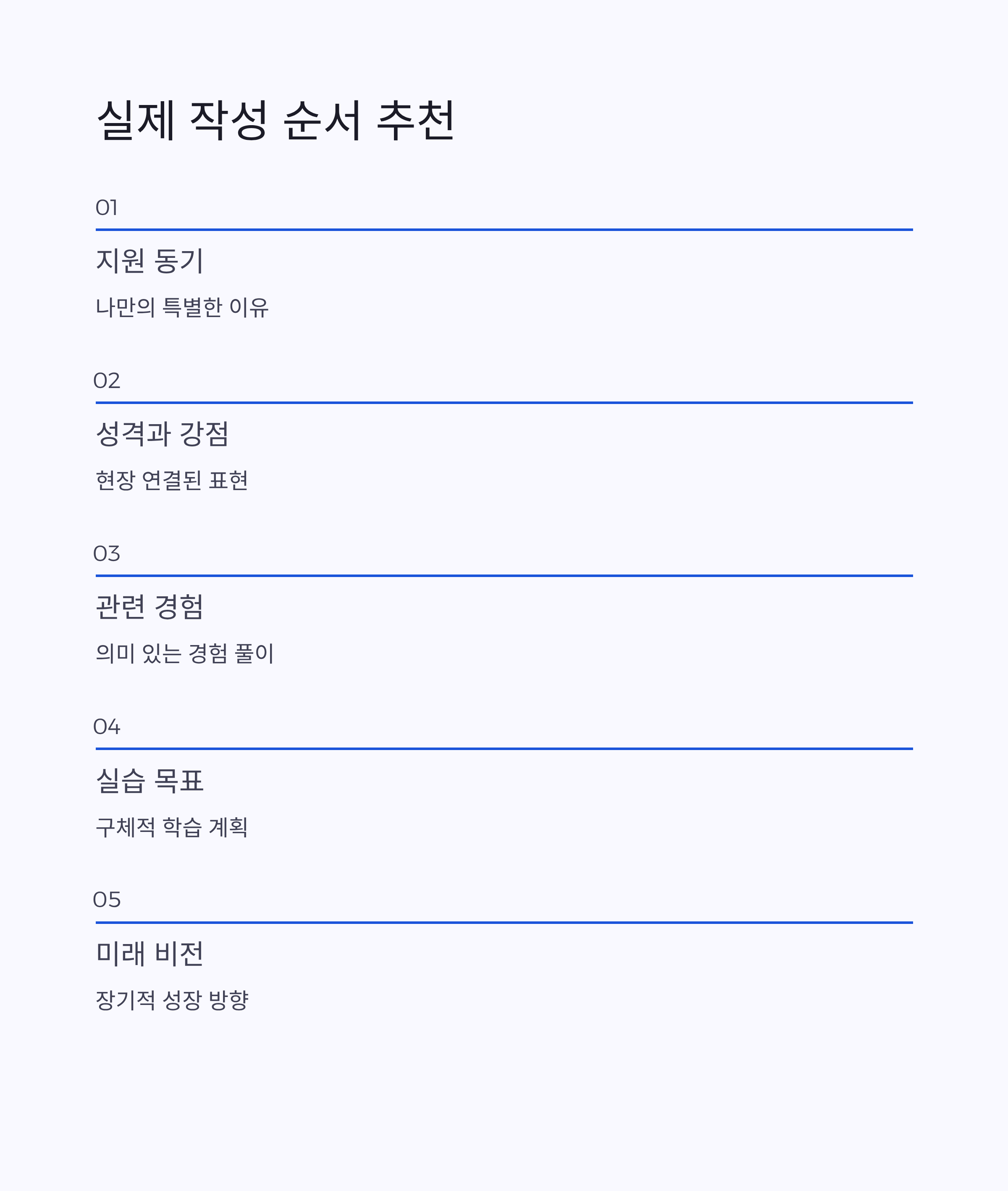 마지막으로 중요한 건 톤입니다. 자기 자랑보다는 배움의 자세를 강조하는 편이 좋아요. "저는 이미 잘합니다"보다 "실습을 통해 더 배우고 싶습니다"라는 태도가 훨씬 진정성 있게 다가옵니다.