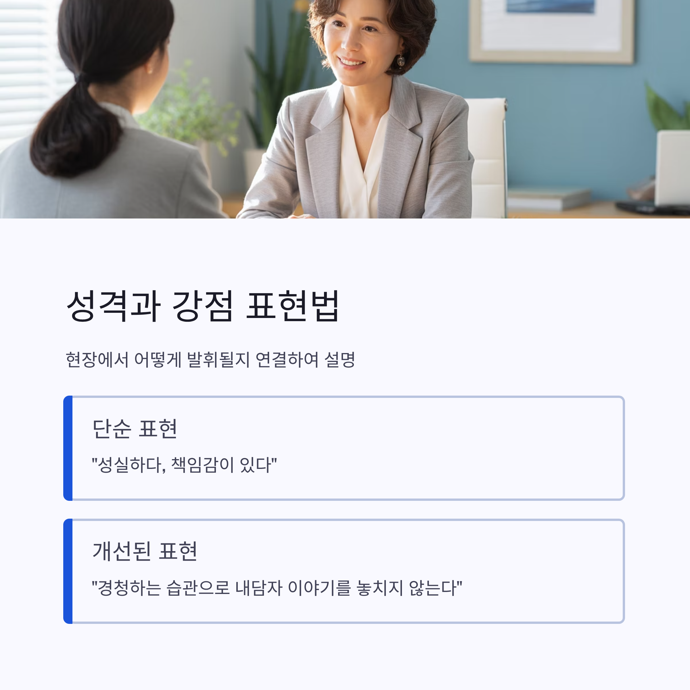 성격을 이야기할 때는 단순히 성실하다, 책임감이 있다보다 현장에서 어떻게 발휘될 수 있는지를 연결하는 게 좋아요. 예를 들어 "경청하는 습관이 있어 내담자의 이야기를 놓치지 않는다"처럼 상황과 연결하면 훨씬 생생하게 전달됩니다.