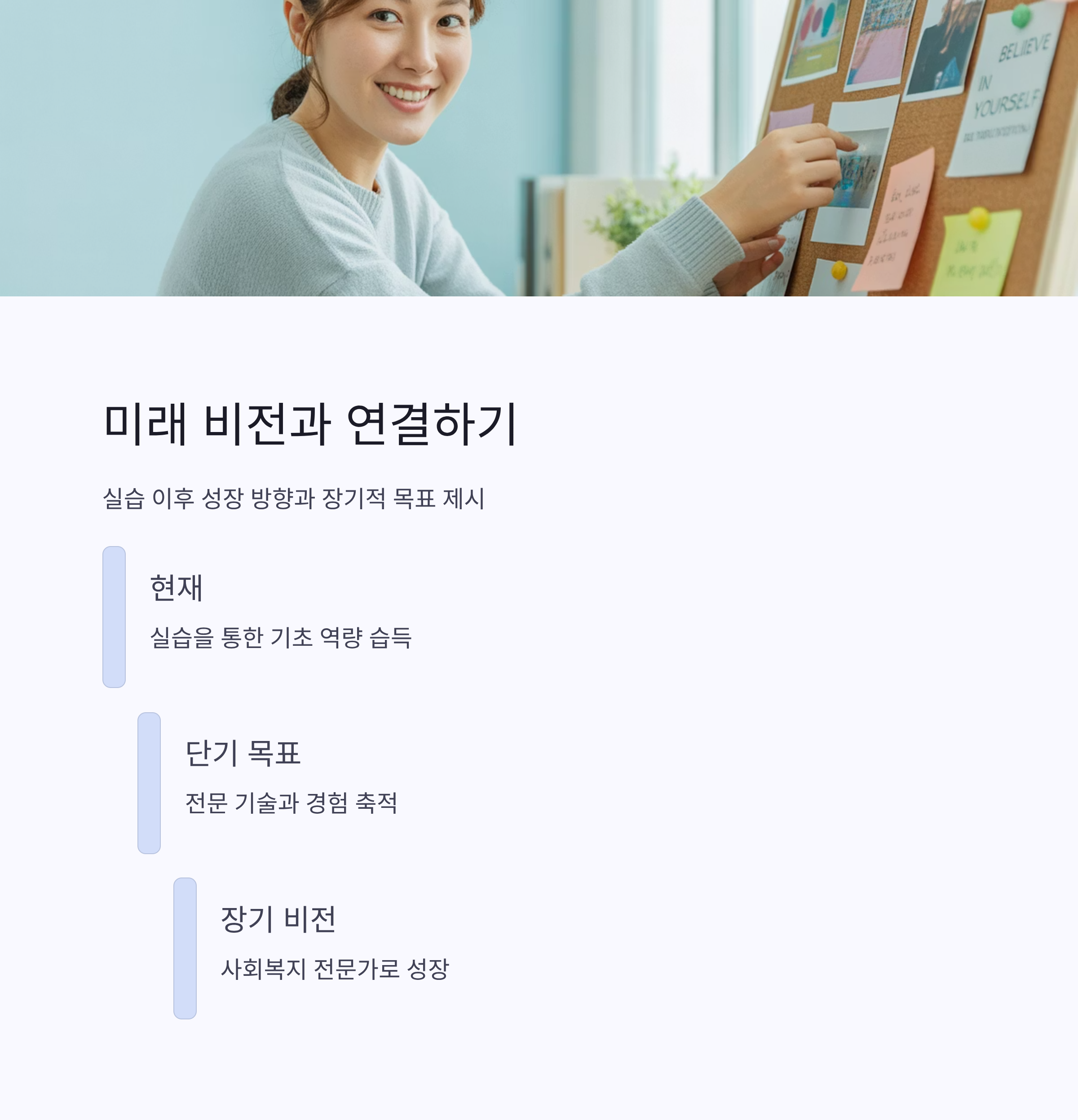 실습 이후 어떤 사회복지사가 되고 싶은지, 장기적으로 어떻게 성장하고 싶은지를 함께 적으면 글의 마무리가 단단해집니다. 작은 다짐이라도 좋습니다.